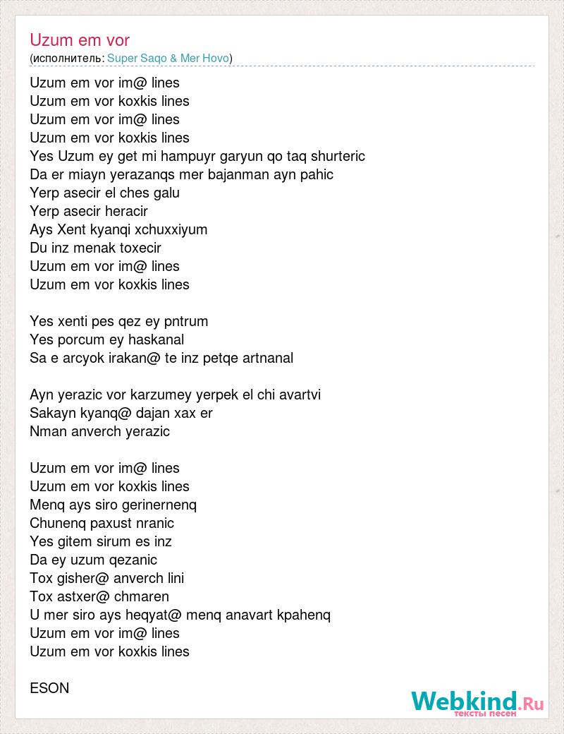 Uzum em vor im@ lines Uzum em vor koxkis lines Uzum em vor im@ lines Uzum em vor koxkis lines Yes Uzum ey get mi hampuyr garyun qo taq shurteric Da er miayn yerazanqs mer bajanman ayn pahic Yerp asecir el ches galu Yerp asecir heracir Ays Xent kyanqi xchuxxiyum Du inz menak toxecir Uzum em vor im@ lines Uzum em vor koxkis lines Yes xenti pes qez ey pntrum Yes porcum ey haskanal Sa e arcyok irakan@ te inz petqe artnanal Ayn yerazic vor karzumey yerpek el chi avartvi Sakayn kyanq@ dajan xax er Nman anverch yerazic Uzum em vor im@ lines Uzum em vor koxkis lines Menq ays siro gerinernenq Chunenq paxust nranic Yes gitem sirum es inz Da ey uzum qezanic Tox gisher@ anverch lini Tox astxer@ chmaren U mer siro ays heqyat@ menq anavart kpahenq Uzum em vor im@ lines Uzum em vor koxkis lines ESON