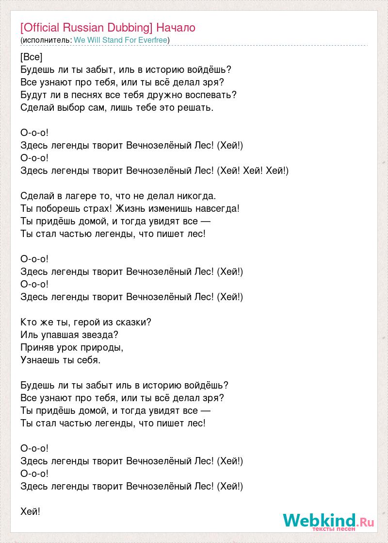[Все] Будешь ли ты забыт, иль в историю войдёшь? Все узнают про тебя, или ты всё делал зря? Будут ли в песнях все тебя дружно воспевать? Сделай выбор сам, лишь тебе это решать. О-о-о! Здесь легенды творит Вечнозелёный Лес! (Хей!) О-о-о! Здесь легенды творит Вечнозелёный Лес! (Хей! Хей! Хей!) Сделай в лагере то, что не делал никогда. Ты поборешь страх! Жизнь изменишь навсегда! Ты придёшь домой, и тогда увидят все — Ты стал частью легенды, что пишет лес! О-о-о! Здесь легенды творит Вечнозелёный Лес! (Хей!) О-о-о! Здесь легенды творит Вечнозелёный Лес! (Хей!) Кто же ты, герой из сказки? Иль упавшая звезда? Приняв урок природы, Узнаешь ты себя. Будешь ли ты забыт иль в историю войдёшь? Все узнают про тебя, или ты всё делал зря? Ты придёшь домой, и тогда увидят все — Ты стал частью легенды, что пишет лес! О-о-о! Здесь легенды творит Вечнозелёный Лес! (Хей!) О-о-о! Здесь легенды творит Вечнозелёный Лес! (Хей!) Хей!