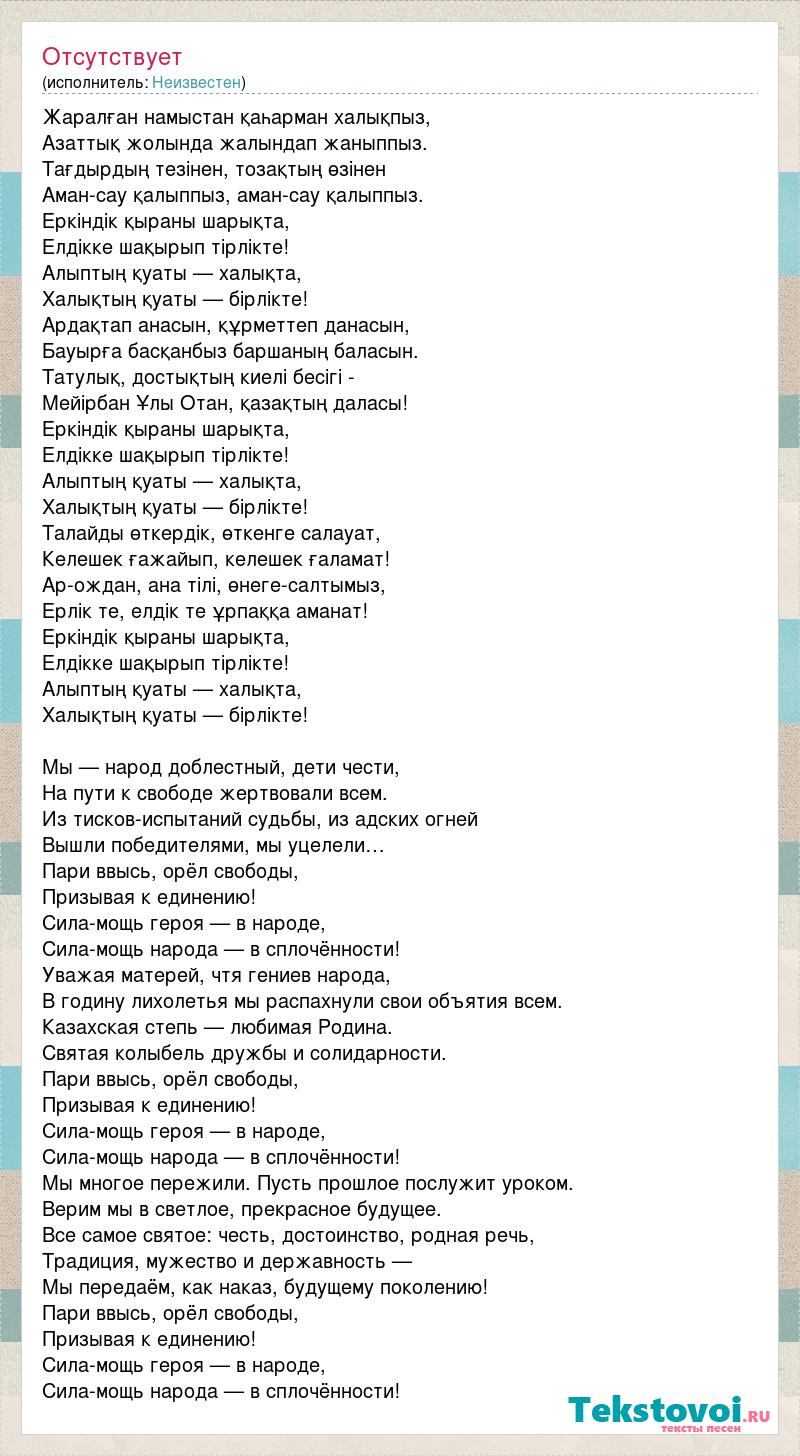 Жаралған намыстан қаһарман халықпыз, Азаттық жолында жалындап жаныппыз. Тағдырдың тезінен, тозақтың өзінен Аман-сау қалыппыз, аман-сау қалыппыз. Еркіндік қыраны шарықта, Елдікке шақырып тірлікте! Алыптың қуаты — халықта, Халықтың қуаты — бірлікте! Ардақтап анасын, құрметтеп данасын, Бауырға басқанбыз баршаның баласын. Татулық, достықтың киелі бесігі - Мейірбан Ұлы Отан, қазақтың даласы! Еркіндік қыраны шарықта, Елдікке шақырып тірлікте! Алыптың қуаты — халықта, Халықтың қуаты — бірлікте! Талайды өткердік, өткенге салауат, Келешек ғажайып, келешек ғаламат! Ар-ождан, ана тілі, өнеге-салтымыз, Ерлік те, елдік те ұрпаққа аманат! Еркіндік қыраны шарықта, Елдікке шақырып тірлікте! Алыптың қуаты — халықта, Халықтың қуаты — бірлікте! Мы — народ доблестный, дети чести, На пути к свободе жертвовали всем. Из тисков-испытаний судьбы, из адских огней Вышли победителями, мы уцелели… Пари ввысь, орёл свободы, Призывая к единению! Сила-мощь героя — в народе, Сила-мощь народа — в сплочённости! Уважая матерей, чтя гениев народа, В годину лихолетья мы распахнули свои объятия всем. Казахская степь — любимая Родина. Святая колыбель дружбы и солидарности. Пари ввысь, орёл свободы, Призывая к единению! Сила-мощь героя — в народе, Сила-мощь народа — в сплочённости! Мы многое пережили. Пусть прошлое послужит уроком. Верим мы в светлое, прекрасное будущее. Все самое святое: честь, достоинство, родная речь, Традиция, мужество и державность — Мы передаём, как наказ, будущему поколению! Пари ввысь, орёл свободы, Призывая к единению! Сила-мощь героя — в народе, Сила-мощь народа — в сплочённости!
