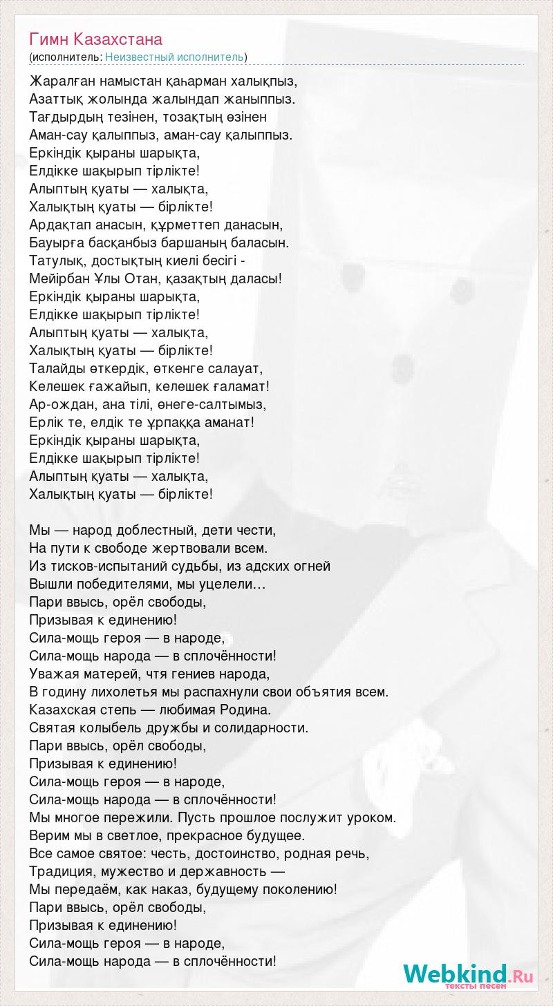 Жаралған намыстан қаһарман халықпыз, Азаттық жолында жалындап жаныппыз. Тағдырдың тезінен, тозақтың өзінен Аман-сау қалыппыз, аман-сау қалыппыз. Еркіндік қыраны шарықта, Елдікке шақырып тірлікте! Алыптың қуаты — халықта, Халықтың қуаты — бірлікте! Ардақтап анасын, құрметтеп данасын, Бауырға басқанбыз баршаның баласын. Татулық, достықтың киелі бесігі - Мейірбан Ұлы Отан, қазақтың даласы! Еркіндік қыраны шарықта, Елдікке шақырып тірлікте! Алыптың қуаты — халықта, Халықтың қуаты — бірлікте! Талайды өткердік, өткенге салауат, Келешек ғажайып, келешек ғаламат! Ар-ождан, ана тілі, өнеге-салтымыз, Ерлік те, елдік те ұрпаққа аманат! Еркіндік қыраны шарықта, Елдікке шақырып тірлікте! Алыптың қуаты — халықта, Халықтың қуаты — бірлікте! Мы — народ доблестный, дети чести, На пути к свободе жертвовали всем. Из тисков-испытаний судьбы, из адских огней Вышли победителями, мы уцелели… Пари ввысь, орёл свободы, Призывая к единению! Сила-мощь героя — в народе, Сила-мощь народа — в сплочённости! Уважая матерей, чтя гениев народа, В годину лихолетья мы распахнули свои объятия всем. Казахская степь — любимая Родина. Святая колыбель дружбы и солидарности. Пари ввысь, орёл свободы, Призывая к единению! Сила-мощь героя — в народе, Сила-мощь народа — в сплочённости! Мы многое пережили. Пусть прошлое послужит уроком. Верим мы в светлое, прекрасное будущее. Все самое святое: честь, достоинство, родная речь, Традиция, мужество и державность — Мы передаём, как наказ, будущему поколению! Пари ввысь, орёл свободы, Призывая к единению! Сила-мощь героя — в народе, Сила-мощь народа — в сплочённости!