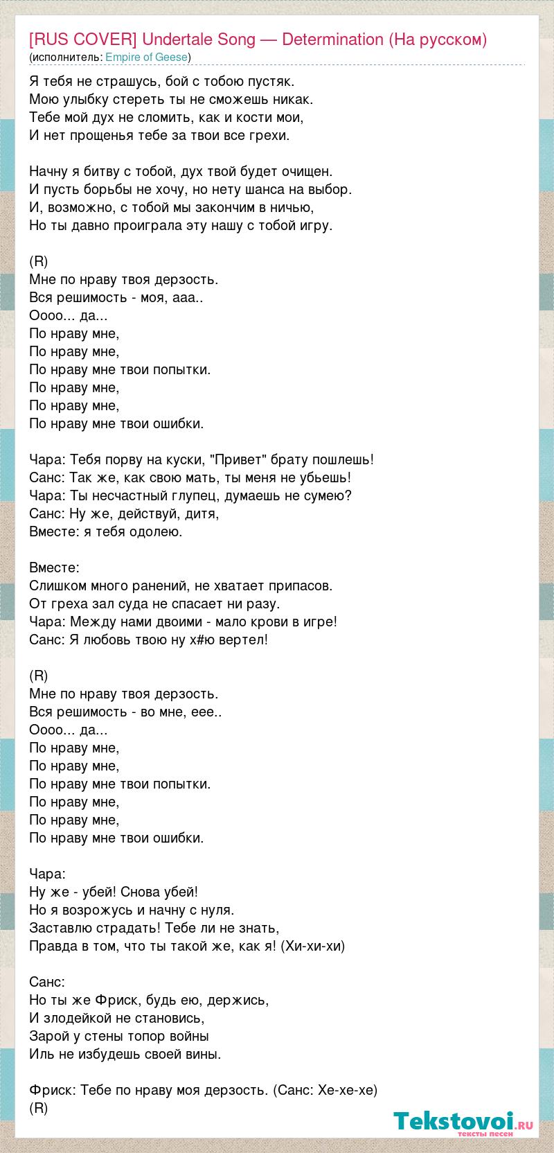 Я тебя не страшусь, бой с тобою пустяк. Мою улыбку стереть ты не сможешь никак. Тебе мой дух не сломить, как и кости мои, И нет прощенья тебе за твои все грехи. Начну я битву с тобой, дух твой будет очищен. И пусть борьбы не хочу, но нету шанса на выбор. И, возможно, с тобой мы закончим в ничью, Но ты давно проиграла эту нашу с тобой игру. (R) Мне по нраву твоя дерзость. Вся решимость - моя, ааа.. Оооо... да... По нраву мне, По нраву мне, По нраву мне твои попытки. По нраву мне, По нраву мне, По нраву мне твои ошибки. Чара: Тебя порву на куски, "Привет" брату пошлешь! Санс: Так же, как свою мать, ты меня не убьешь! Чара: Ты несчастный глупец, думаешь не сумею? Санс: Ну же, действуй, дитя, Вместе: я тебя одолею. Вместе: Слишком много ранений, не хватает припасов. От греха зал суда не спасает ни разу. Чара: Между нами двоими - мало крови в игре! Санс: Я любовь твою ну х#ю вертел! (R) Мне по нраву твоя дерзость. Вся решимость - во мне, еее.. Оооо... да... По нраву мне, По нраву мне, По нраву мне твои попытки. По нраву мне, По нраву мне, По нраву мне твои ошибки. Чара: Ну же - убей! Снова убей! Но я возрожусь и начну с нуля. Заставлю страдать! Тебе ли не знать, Правда в том, что ты такой же, как я! (Хи-хи-хи) Санс: Но ты же Фриск, будь ею, держись, И злодейкой не становись, Зарой у стены топор войны Иль не избудешь своей вины. Фриск: Тебе по нраву моя дерзость. (Санс: Хе-хе-хе) (R)