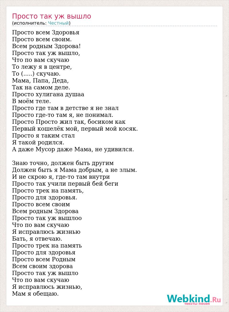 Просто всем Здоровья 💪 Просто всем своим. Всем родным Здорова! Просто так уж вышло, Что по вам скучаю То лежу я в центре, То (.....) скучаю. Мама, Папа, Деда, Так на самом деле. Просто хулигана душаа В моём теле. Просто где там в детстве я не знал Просто где-то там я, не понимал. Просто Просто жил так, босиком как Первый кошелёк мой, первый мой косяк. Просто я таким стал Я такой родился. А даже Мусор даже Мама, не удивился. Знаю точно, должен быть другим Должен быть я Мама добрым, а не злым. И не скрою я, где-то там внутри Просто так учили первый бей беги Просто трек на память, Просто для здоровья. Просто всем своим Всем родным Здорова Просто так уж вышлоо Что по вам скучаю Я исправлюсь жизнью Бать, я отвечаю. Просто трек на память Просто для здоровья Просто всем Родным Всем своим здорова Просто так уж вышло Что по вам скучаю Я исправлюсь жизнью, Мам я обещаю.