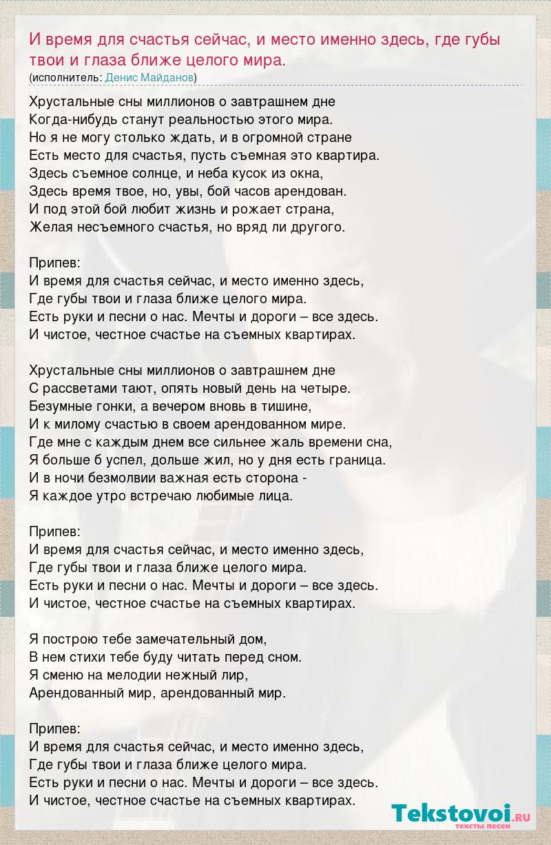 Главная→Исполнители→Денис Майданов→И время для счастья сейчас, и место именно здесь, где губы твои и глаза ближ