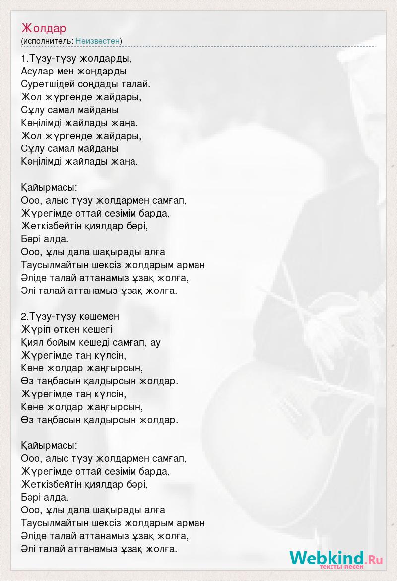 1.Түзу-түзу жолдарды, Асулар мен жоңдарды Суретшідей соңдады талай. Жол жүргенде жайдары, Сұлу самал майданы Көңілімді жайлады жаңа. Жол жүргенде жайдары, Сұлу самал майданы Көңілімді жайлады жаңа. Қайырмасы: Ооо, алыс түзу жолдармен самғап, Жүрегімде оттай сезімім барда, Жеткізбейтін қиялдар бәрі, Бәрі алда. Ооо, ұлы дала шақырады алға Таусылмайтын шексіз жолдарым арман Әліде талай аттанамыз ұзақ жолға, Әлі талай аттанамыз ұзақ жолға. 2.Түзу-түзу көшемен Жүріп өткен кешегі Қиял бойым кешеді самғап, ау Жүрегімде таң күлсін, Көне жолдар жаңғырсын, Өз таңбасын қалдырсын жолдар. Жүрегімде таң күлсін, Көне жолдар жаңғырсын, Өз таңбасын қалдырсын жолдар. Қайырмасы: Ооо, алыс түзу жолдармен самғап, Жүрегімде оттай сезімім барда, Жеткізбейтін қиялдар бәрі, Бәрі алда. Ооо, ұлы дала шақырады алға Таусылмайтын шексіз жолдарым арман Әліде талай аттанамыз ұзақ жолға, Әлі талай аттанамыз ұзақ жолға.
