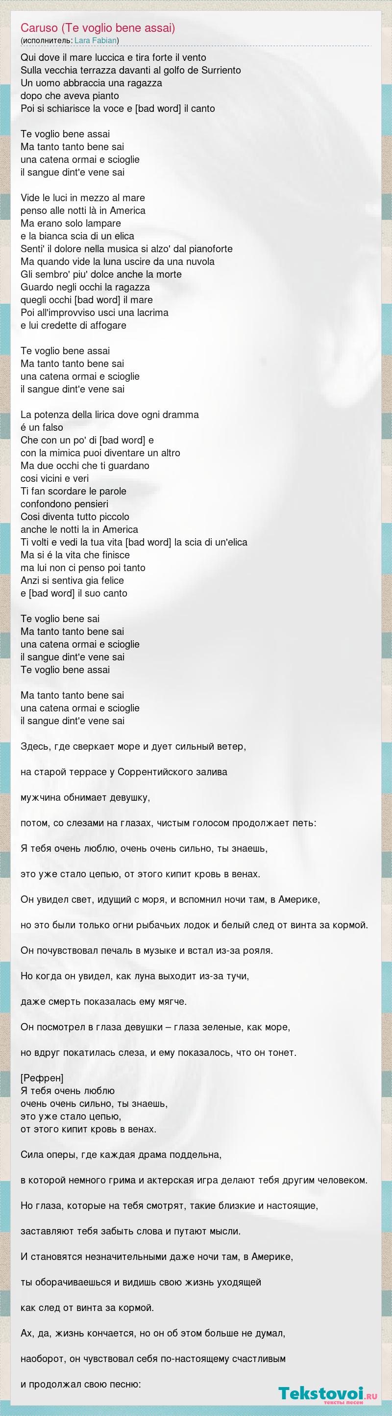 Qui dove il mare lucciсa e tira forte il vento Sulla vecchia terrazza davanti al golfo de Surriento Un uomo abbraccia una ragazza dopo che aveva pianto Poi si schiarisce la voce e [bad word] il canto Te voglio bene assai Ma tanto tanto bene sai una catena ormai e scioglie il sangue dint'e vene sai Vide le luci in mezzo al mare penso alle notti là in America Ma erano solo lampare e la bianca scia di un elica Senti' il dolore nella musica si alzo' dal pianoforte Ma quando vide la luna uscire da una nuvola Gli sembro' piu' dolce anche la morte Guardo negli occhi la ragazza quegli occhi [bad word] il mare Poi all'improvviso usci una lacrima e lui credette di affogare Te voglio bene assai Ma tanto tanto bene sai una catena ormai e scioglie il sangue dint'e vene sai La potenza della lirica dove ogni dramma é un falso Che con un po' di [bad word] e con la mimica puoi diventare un altro Ma due occhi che ti guardano cosi vicini e veri Ti fan scordare le parole confondono pensieri Cosi diventa tutto piccolo anche le notti la in America Ti volti e vedi la tua vita [bad word] la scia di un'elica Ma si é la vita che finisce ma lui non ci penso poi tanto Anzi si sentiva gia felice e [bad word] il suo canto Te voglio bene sai Ma tanto tanto bene sai una catena ormai e scioglie il sangue dint'e vene sai Te voglio bene assai Ma tanto tanto bene sai una catena ormai e scioglie il sangue dint'e vene sai Здесь, где сверкает море и дует сильный ветер, на старой террасе у Соррентийского залива мужчина обнимает девушку, потом, со слезами на глазах, чистым голосом продолжает петь: Я тебя очень люблю, очень очень сильно, ты знаешь, это уже стало цепью, от этого кипит кровь в венах. Он увидел свет, идущий с моря, и вспомнил ночи там, в Америке, но это были только огни рыбачьих лодок и белый след от винта за кормой. Он почувствовал печаль в музыке и встал из-за рояля. Но когда он увидел, как луна выходит из-за тучи, даже смерть показалась ему мягче. Он посмотрел в глаза девушки – глаза зеленые, как море, но вдруг покатилась слеза, и ему показалось, что он тонет. [Рефрен] Я тебя очень люблю очень очень сильно, ты знаешь, это уже стало цепью, от этого кипит кровь в венах. Сила оперы, где каждая драма поддельна, в которой немного грима и актерская игра делают тебя другим человеком. Но глаза, которые на тебя смотрят, такие близкие и настоящие, заставляют тебя забыть слова и путают мысли. И становятся незначительными даже ночи там, в Америке, ты оборачиваешься и видишь свою жизнь уходящей как след от винта за кормой. Ах, да, жизнь кончается, но он об этом больше не думал, наоборот, он чувствовал себя по-настоящему счастливым и продолжал свою песню: