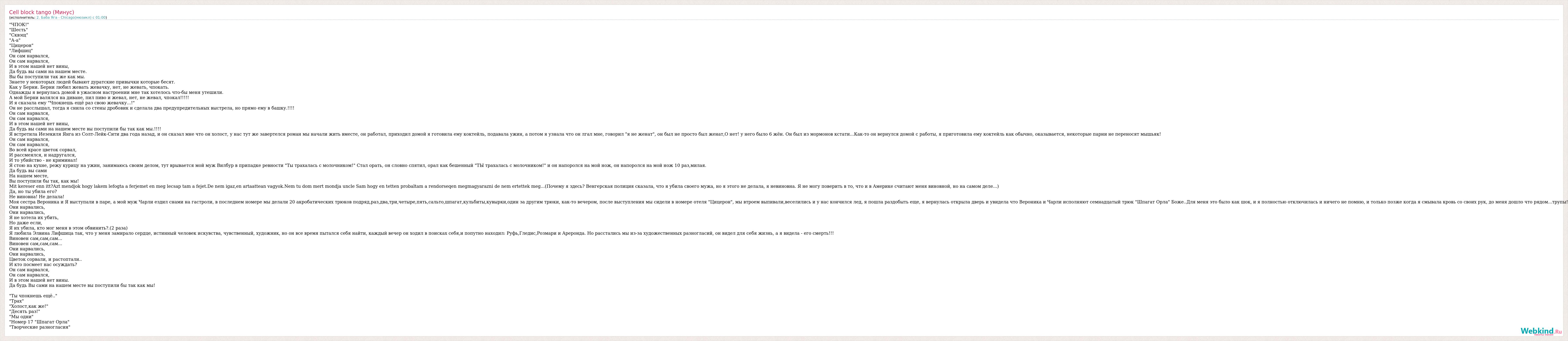 "ЧПОК!" "Шесть" "Сквэщ" "А-а" "Цицерон" "Лифшиц" Он сам нарвался, Он сам нарвался, И в этом нашей нет вины, Да будь вы сами на нашем месте. Вы бы поступили так же как мы. Знаете у некоторых людей бывают дуратские привычки которые бесят. Как у Берни. Берни любил жевать жевачку, нет, не жевать, чпокать. Однажды я вернулась домой в ужасном настроении мне так хотелось что-бы меня утешили. А мой Берни валялся на диване, пил пиво и жевал, нет, не жевал, чпокал!!!!! И я сказала ему "Чпокнешь ещё раз свою жевачку...!" Он не расслышал, тогда я снила со стены дробовик и сделала два предупредительных выстрела, но прямо ему в башку.!!!! Он сам нарвался, Он сам нарвался, И в этом нашей нет вины, Да будь вы сами на нашем месте вы поступили бы так как мы.!!!! Я встретила Иезекиля Янга из Солт-Лейк-Сити два года назад, и он сказал мне что он холост, у нас тут же завертелся роман мы начали жить вместе, он работал, приходил домой я готовила ему коктейль, подавала ужин, а потом я узнала что он лгал мне, говорил "я не женат", он был не просто был женат,О нет! у него было 6 жён. Он был из мормонов кстати...Как-то он вернулся домой с работы, я приготовила ему коктейль как обычно, оказывается, некоторые парни не переносят мышьяк! Он сам нарвался, Он сам нарвался, Во всей красе цветок сорвал, И рассмеялся, и надругался, И то убийство - не криминал! Я стою на кухне, режу курицу на ужин, занимаюсь своим делом, тут врывается мой муж Вилбур в припадке ревности "Ты трахалась с молочником!" Стал орать, он словно спятил, орал как бешенный "ТЫ трахалась с молочником!" и он напоролся на мой нож, он напоролся на мой нож 10 раз,милая. Да будь вы сами На нашем месте, Вы поступили бы так, как мы! Mit kereser enn itt?Azt mendjok hogy lakem lefogta a ferjemet en meg lecsap tam a fejet.De nem igaz,en artaattean vagyok.Nem tu dom mert mondja uncle Sam hogy en tetten probaltam a rendorseqen megmagyarazni de nem ertettek meg...(Почему я здесь? Венгерская полиция сказала, что я убила своего мужа, но я этого не делала, я невиновна. Я не могу поверить в то, что и в Америке считают меня виновной, но на самом деле...) Да, но ты убила его? Не виновна! Не делала! Моя сестра Вероника и Я выступали в паре, а мой муж Чарли ездил снами на гастроли, в последнем номере мы делали 20 акробатических трюков подряд,раз,два,три,четыре,пять,сальто,шпагат,кульбиты,кувырки,один за другим трюки, как-то вечером, после выступления мы сидели в номере отеля "Цицерон", мы втроем выпивали,веселились и у нас кончился лед, я пошла раздобыть еще, я вернулась открыла дверь и увидела что Вероника и Чарли исполняют семнадцатый трюк "Шпагат Орла" Боже..Для меня это было как шок, и я полностью отключилась и ничего не помню, и только позже когда я смывала кровь со своих рук, до меня дошло что рядом...трупы! Они нарвались, Они нарвались, Я не хотела их убить, Но даже если, Я их убила, кто мог меня в этом обвинить?.(2 раза) Я любила Элвина Лифшица так, что у меня замирало сердце, истинный человек искувства, чувственный, художник, но он все время пытался себя найти, каждый вечер он ходил в поисках себя,и попутно находил: Руфь,Гледис,Розмари и Ареронда. Но расстались мы из-за художественных разногласий, он видел для себя жизнь, а я видела - его смерть!!! Виновен сам,сам,сам... Виновен сам,сам,сам... Они нарвались, Они нарвались, Цветок сорвали, и растоптали.. И кто посмеет нас осуждать? Он сам нарвался, Он сам нарвался, И в этом нашей нет вины. Да будь Вы сами на нашем месте вы поступили бы так как мы! "Ты чпокн