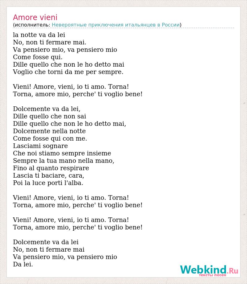 la notte va da lei No, non ti fermare mai. Va pensiero mio, va pensiero mio Come fosse qui. Dille quello che non le ho detto mai Voglio che torni da me per sempre. Vieni! Amore, vieni, io ti amo. Torna! Torna, amore mio, perche' ti voglio bene! Dolcemente va da lei, Dille quello che non sai Dille quello che non le ho detto mai, Dolcemente nella notte Come fosse qui con me. Lasciami sognare Che noi stiamo sempre insieme Sempre la tua mano nella mano, Fino al quanto respirare Lascia ti baciare, cara, Poi la luce porti l'alba. Vieni! Amore, vieni, io ti amo. Torna! Torna, amore mio, perche' ti voglio bene! Vieni! Amore, vieni, io ti amo. Torna! Torna, amore mio, perche' ti voglio bene! Dolcemente va da lei No, non ti fermare mai Va pensiero mio, va pensiero mio Da lei.