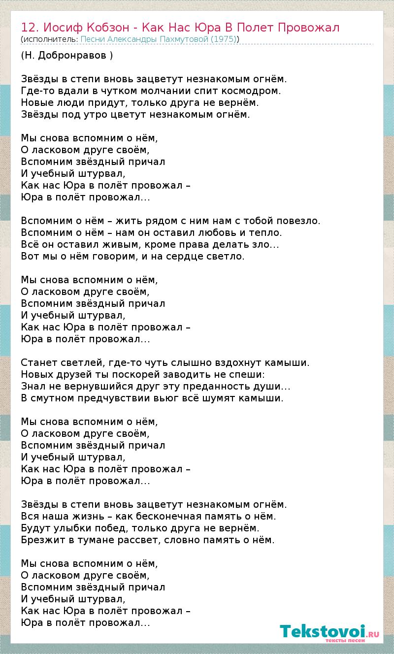 (Н. Добронравов ) Звёзды в степи вновь зацветут незнакомым огнём. Где-то вдали в чутком молчании спит космодром. Новые люди придут, только друга не вернём. Звёзды под утро цветут незнакомым огнём. Мы снова вспомним о нём, О ласковом друге своём, Вспомним звёздный причал И учебный штурвал, Как нас Юра в полёт провожал – Юра в полёт провожал… Вспомним о нём – жить рядом с ним нам с тобой повезло. Вспомним о нём – нам он оставил любовь и тепло. Всё он оставил живым, кроме права делать зло… Вот мы о нём говорим, и на сердце светло. Мы снова вспомним о нём, О ласковом друге своём, Вспомним звёздный причал И учебный штурвал, Как нас Юра в полёт провожал – Юра в полёт провожал… Станет светлей, где-то чуть слышно вздохнут камыши. Новых друзей ты поскорей заводить не спеши: Знал не вернувшийся друг эту преданность души… В смутном предчувствии вьюг всё шумят камыши. Мы снова вспомним о нём, О ласковом друге своём, Вспомним звёздный причал И учебный штурвал, Как нас Юра в полёт провожал – Юра в полёт провожал… Звёзды в степи вновь зацветут незнакомым огнём. Вся наша жизнь – как бесконечная память о нём. Будут улыбки побед, только друга не вернём. Брезжит в тумане рассвет, словно память о нём. Мы снова вспомним о нём, О ласковом друге своём, Вспомним звёздный причал И учебный штурвал, Как нас Юра в полёт провожал – Юра в полёт провожал…