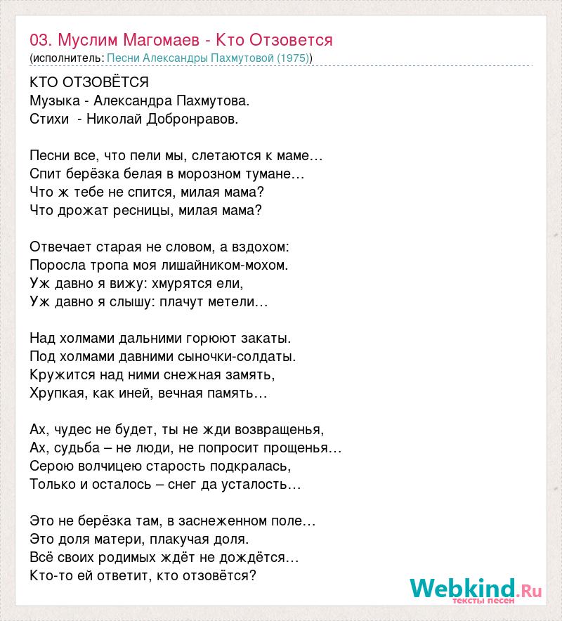 КТО ОТЗОВЁТСЯ Музыка - Александра Пахмутова. Стихи - Николай Добронравов. Песни все, что пели мы, слетаются к маме… Спит берёзка белая в морозном тумане… Что ж тебе не спится, милая мама? Что дрожат ресницы, милая мама? Отвечает старая не словом, а вздохом: Поросла тропа моя лишайником-мохом. Уж давно я вижу: хмурятся ели, Уж давно я слышу: плачут метели… Над холмами дальними горюют закаты. Под холмами давними сыночки-солдаты. Кружится над ними снежная замять, Хрупкая, как иней, вечная память… Ах, чудес не будет, ты не жди возвращенья, Ах, судьба – не люди, не попросит прощенья… Серою волчицею старость подкралась, Только и осталось – снег да усталость… Это не берёзка там, в заснеженном поле… Это доля матери, плакучая доля. Всё своих родимых ждёт не дождётся… Кто-то ей ответит, кто отзовётся?