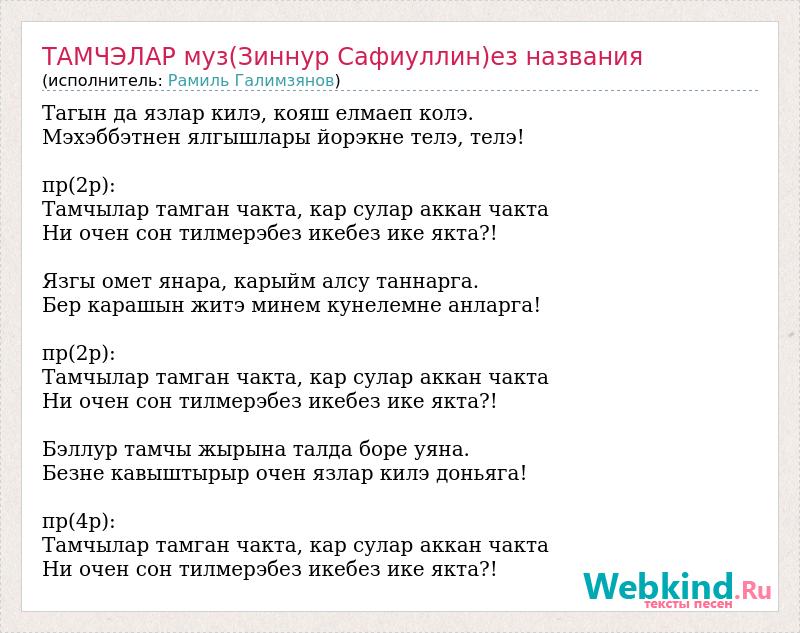 Тагын да язлар килэ, кояш елмаеп колэ. Мэхэббэтнен ялгышлары йорэкне телэ, телэ! пр(2р): Тамчылар тамган чакта, кар сулар аккан чакта Ни очен сон тилмерэбез икебез ике якта?! Язгы омет янара, карыйм алсу таннарга. Бер карашын житэ минем кунелемне анларга! пр(2р): Тамчылар тамган чакта, кар сулар аккан чакта Ни очен сон тилмерэбез икебез ике якта?! Бэллур тамчы жырына талда боре уяна. Безне кавыштырыр очен язлар килэ доньяга! пр(4р): Тамчылар тамган чакта, кар сулар аккан чакта Ни очен сон тилмерэбез икебез ике якта?!