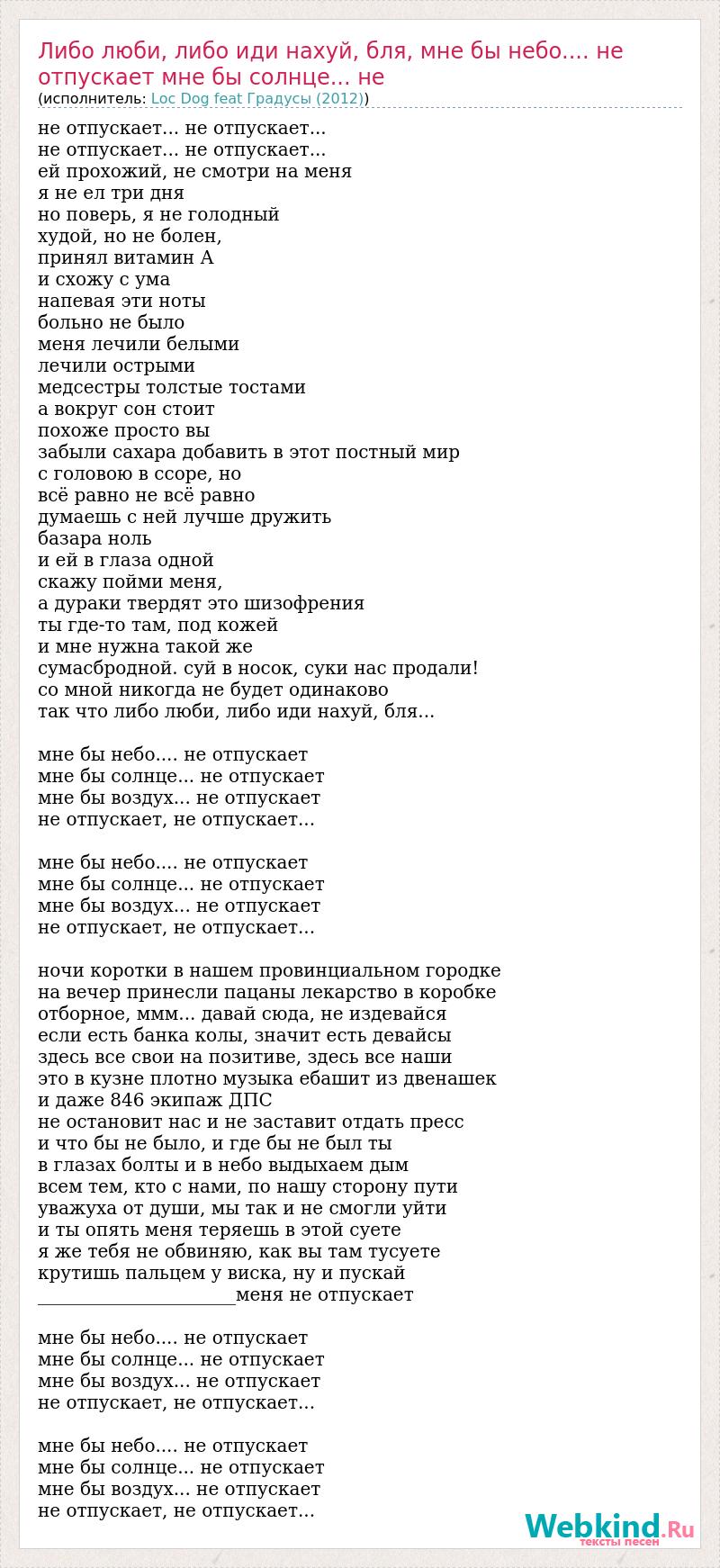 Главная→Исполнители→Loc Dog feat Градусы (2012)→Либо люби, либо иди нахуй, бля, мне бы небо.... не отпускает мне бы солнце... н