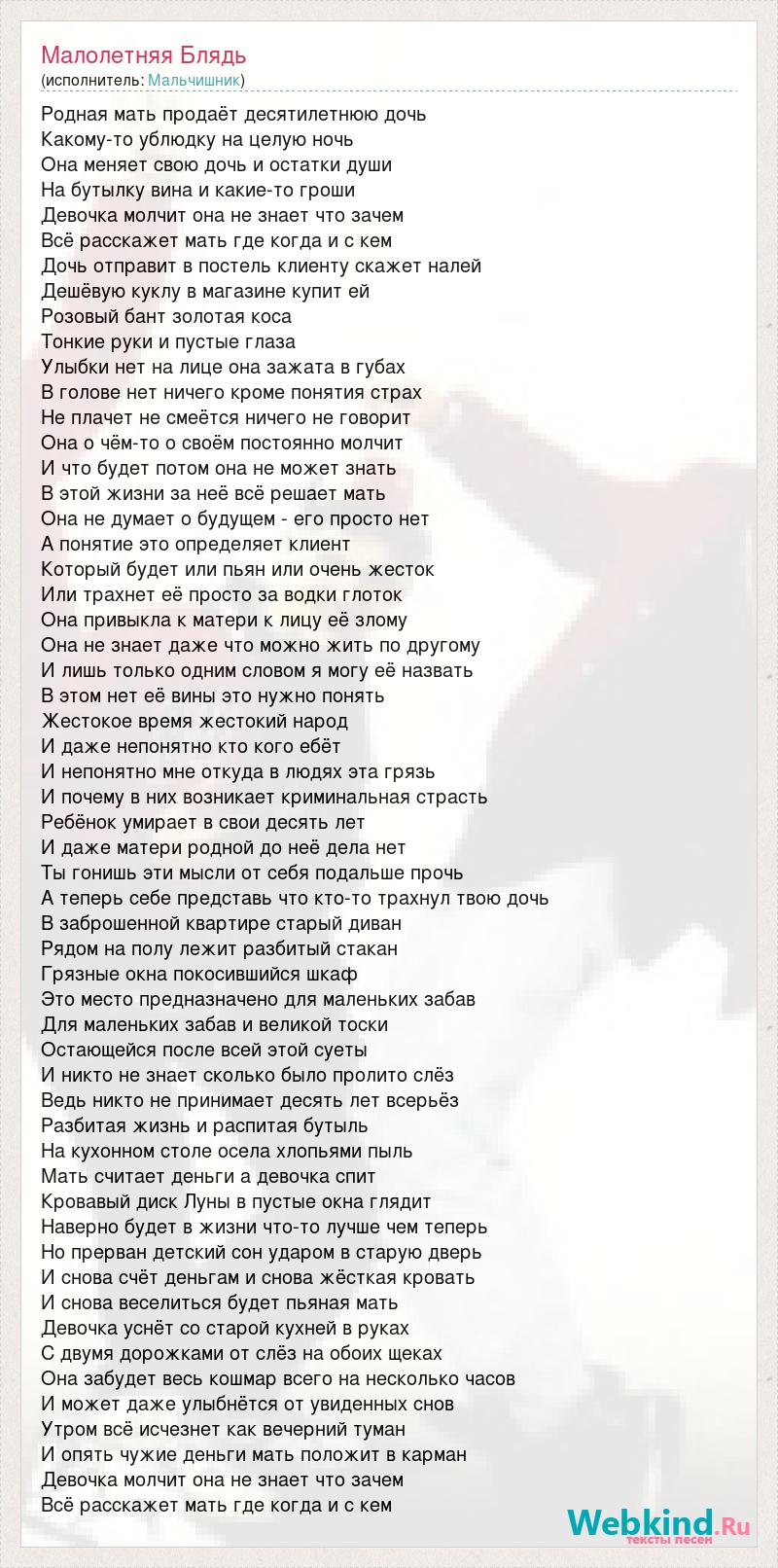 Родная мать продаёт десятилетнюю дочь Какому-то ублюдку на целую ночь Она меняет свою дочь и остатки души На бутылку вина и какие-то гроши Девочка молчит она не знает что зачем Всё расскажет мать где когда и с кем Дочь отправит в постель клиенту скажет налей Дешёвую куклу в магазине купит ей Розовый бант золотая коса Тонкие руки и пустые глаза Улыбки нет на лице она зажата в губах В голове нет ничего кроме понятия страх Не плачет не смеётся ничего не говорит Она о чём-то о своём постоянно молчит И что будет потом она не может знать В этой жизни за неё всё решает мать Она не думает о будущем - его просто нет А понятие это определяет клиент Который будет или пьян или очень жесток Или трахнет её просто за водки глоток Она привыкла к матери к лицу её злому Она не знает даже что можно жить по другому И лишь только одним словом я могу её назвать В этом нет её вины это нужно понять Жестокое время жестокий народ И даже непонятно кто кого ебёт И непонятно мне откуда в людях эта грязь И почему в них возникает криминальная страсть Ребёнок умирает в свои десять лет И даже матери родной до неё дела нет Ты гонишь эти мысли от себя подальше прочь А теперь себе представь что кто-то трахнул твою дочь В заброшенной квартире старый диван Рядом на полу лежит разбитый стакан Грязные окна покосившийся шкаф Это место предназначено для маленьких забав Для маленьких забав и великой тоски Остающейся после всей этой суеты И никто не знает сколько было пролито слёз Ведь никто не принимает десять лет всерьёз Разбитая жизнь и распитая бутыль На кухонном столе осела хлопьями пыль Мать считает деньги а девочка спит Кровавый диск Луны в пустые окна глядит Наверно будет в жизни что-то лучше чем теперь Но прерван детский сон ударом в старую дверь И снова счёт деньгам и снова жёсткая кровать И снова веселиться будет пьяная мать Девочка уснёт со старой кухней в руках С двумя дорожками от слёз на обоих щеках Она забудет весь кошмар всего на несколько часов И может даже улыбнётся от увиденных снов Утром всё исчезнет как вечерний туман И опять чужие деньги мать положит в карман Девочка молчит она не знает что зачем Всё расскажет мать где когда и с кем