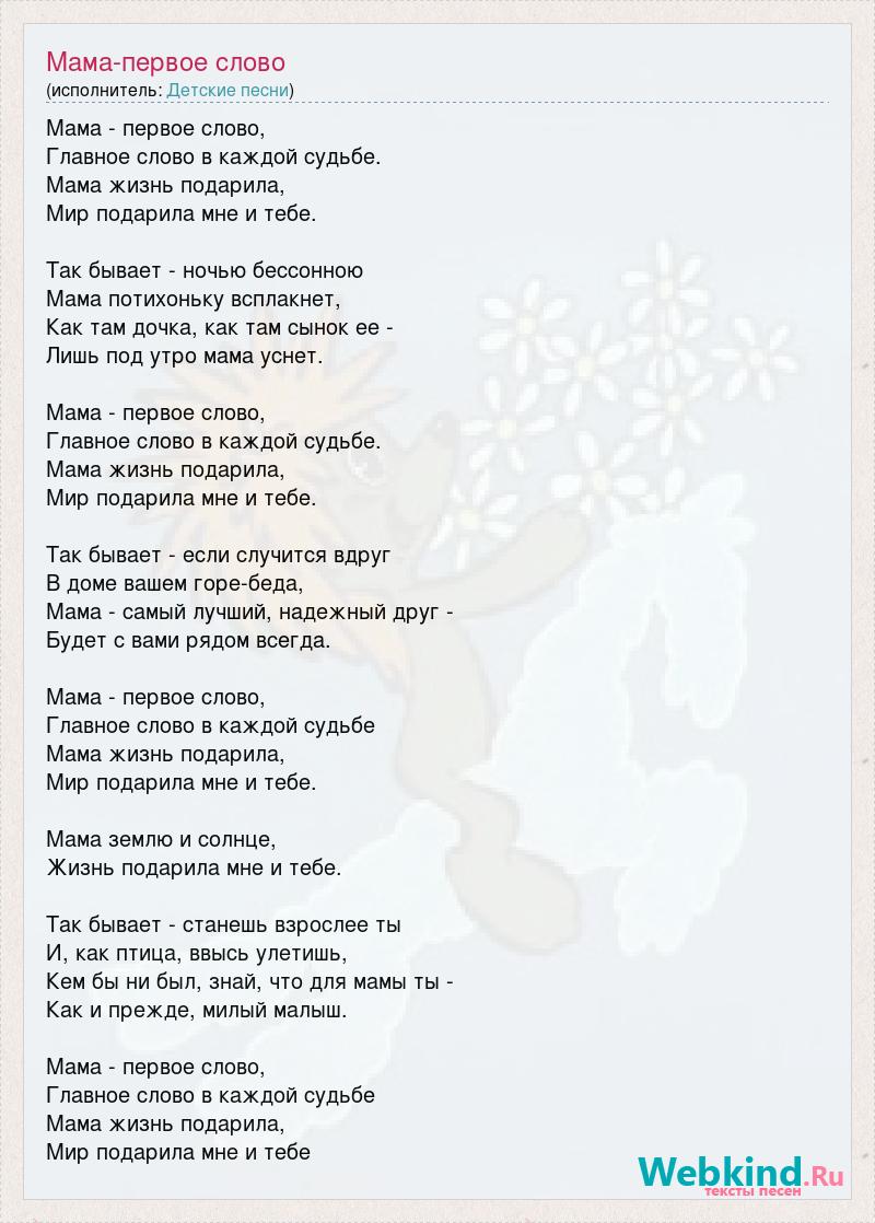 Мама - первое слово, Главное слово в каждой судьбе. Мама жизнь подарила, Мир подарила мне и тебе. Так бывает - ночью бессонною Мама потихоньку всплакнет, Как там дочка, как там сынок ее - Лишь под утро мама уснет. Мама - первое слово, Главное слово в каждой судьбе. Мама жизнь подарила, Мир подарила мне и тебе. Так бывает - если случится вдруг В доме вашем горе-беда, Мама - самый лучший, надежный друг - Будет с вами рядом всегда. Мама - первое слово, Главное слово в каждой судьбе Мама жизнь подарила, Мир подарила мне и тебе. Мама землю и солнце, Жизнь подарила мне и тебе. Так бывает - станешь взрослее ты И, как птица, ввысь улетишь, Кем бы ни был, знай, что для мамы ты - Как и прежде, милый малыш. Мама - первое слово, Главное слово в каждой судьбе Мама жизнь подарила, Мир подарила мне и тебе