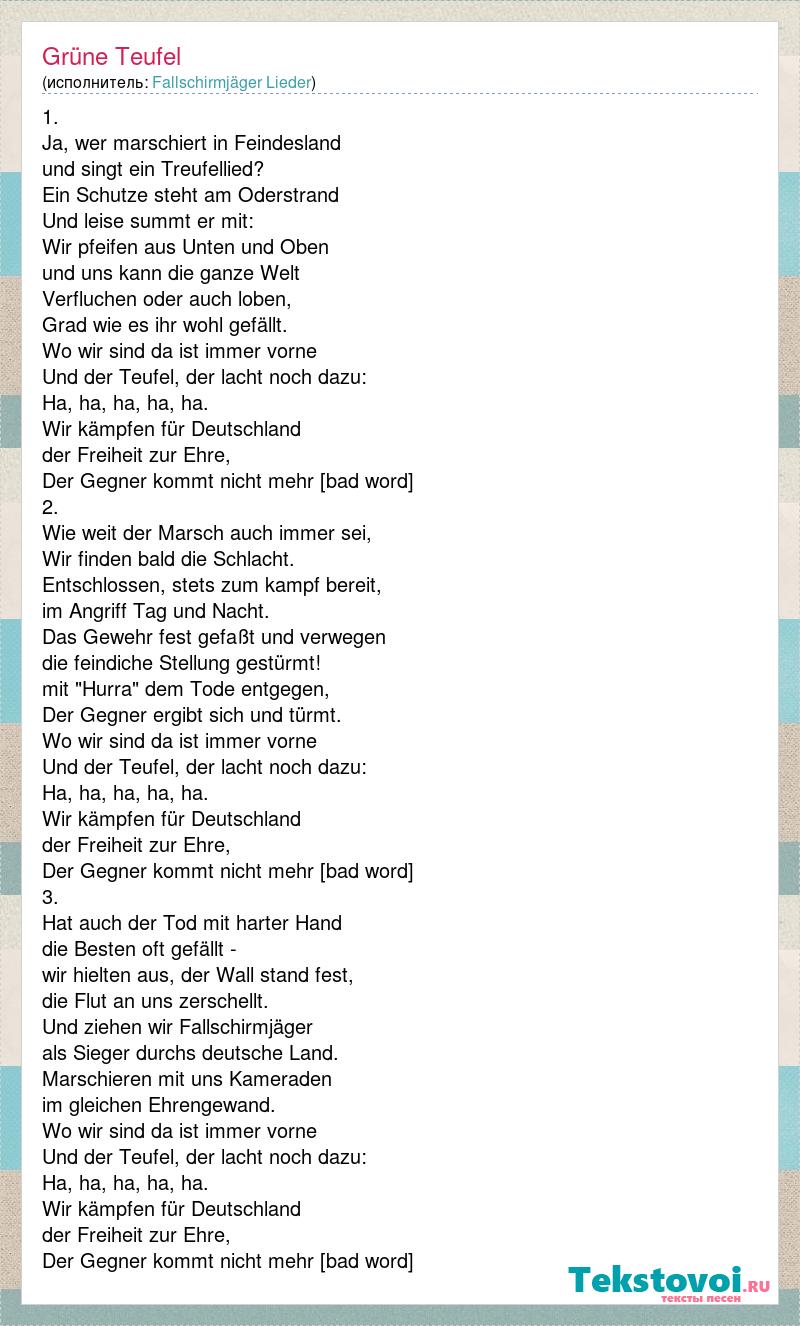 1. Ja, wer marschiert in Feindesland und singt ein Treufellied? Ein Schutze steht am Oderstrand Und leise summt er mit: Wir pfeifen aus Unten und Oben und uns kann die ganze Welt Verfluchen oder auch loben, Grad wie es ihr wohl gefällt. Wo wir sind da ist immer vorne Und der Teufel, der lacht noch dazu: Ha, ha, ha, ha, ha. Wir kämpfen für Deutschland der Freiheit zur Ehre, Der Gegner kommt nicht mehr zur Ruh 2. Wie weit der Marsch auch immer sei, Wir finden bald die Schlacht. Entschlossen, stets zum kampf bereit, im Angriff Tag und Nacht. Das Gewehr fest gefaßt und verwegen die feindiche Stellung gestürmt! mit "Hurra" dem Tode entgegen, Der Gegner ergibt sich und türmt. Wo wir sind da ist immer vorne Und der Teufel, der lacht noch dazu: Ha, ha, ha, ha, ha. Wir kämpfen für Deutschland der Freiheit zur Ehre, Der Gegner kommt nicht mehr zur Ruh 3. Hat auch der Tod mit harter Hand die Besten oft gefällt - wir hielten aus, der Wall stand fest, die Flut an uns zerschellt. Und ziehen wir Fallschirmjäger als Sieger durchs deutsche Land. Marschieren mit uns Kameraden im gleichen Ehrengewand. Wo wir sind da ist immer vorne Und der Teufel, der lacht noch dazu: Ha, ha, ha, ha, ha. Wir kämpfen für Deutschland der Freiheit zur Ehre, Der Gegner kommt nicht mehr zur Ruh