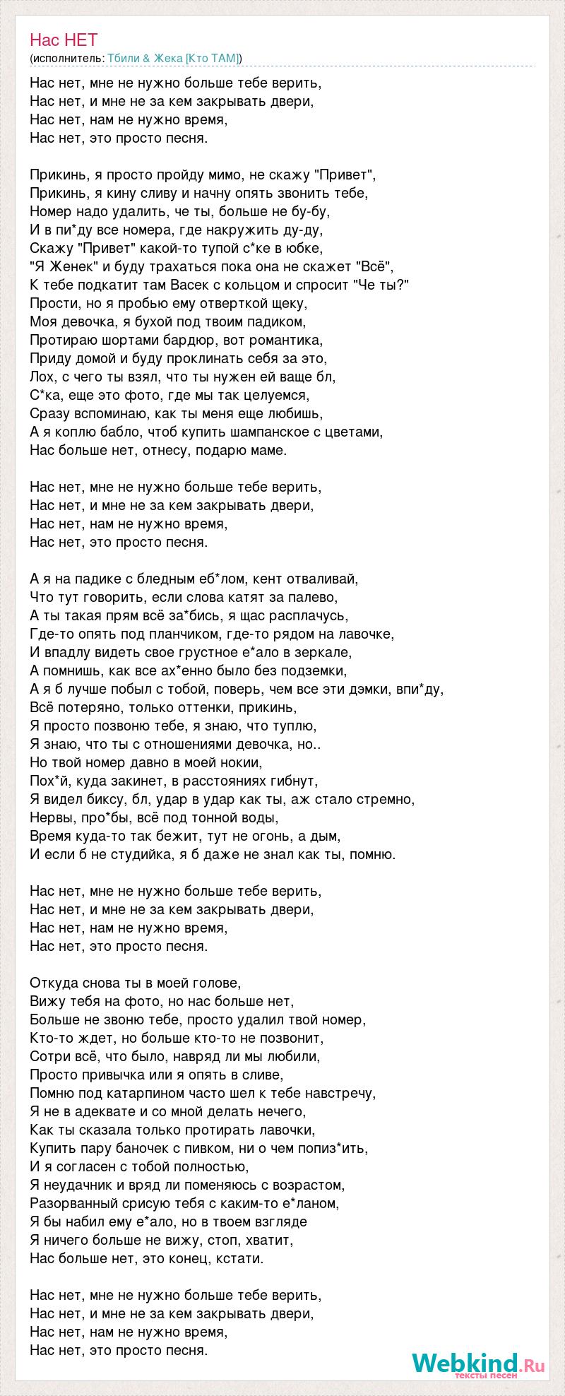 Нас нет, мне не нужно больше тебе верить, Нас нет, и мне не за кем закрывать двери, Нас нет, нам не нужно время, Нас нет, это просто песня. Прикинь, я просто пройду мимо, не скажу "Привет", Прикинь, я кину сливу и начну опять звонить тебе, Номер надо удалить, че ты, больше не бу-бу, И в пи*ду все номера, где накружить ду-ду, Скажу "Привет" какой-то тупой с*ке в юбке, "Я Женек" и буду трахаться пока она не скажет "Всё", К тебе подкатит там Васек с кольцом и спросит "Че ты?" Прости, но я пробью ему отверткой щеку, Моя девочка, я бухой под твоим падиком, Протираю шортами бардюр, вот романтика, Приду домой и буду проклинать себя за это, Лох, с чего ты взял, что ты нужен ей ваще бл, С*ка, еще это фото, где мы так целуемся, Сразу вспоминаю, как ты меня еще любишь, А я коплю бабло, чтоб купить шампанское с цветами, Нас больше нет, отнесу, подарю маме. Нас нет, мне не нужно больше тебе верить, Нас нет, и мне не за кем закрывать двери, Нас нет, нам не нужно время, Нас нет, это просто песня. А я на падике с бледным еб*лом, кент отваливай, Что тут говорить, если слова катят за палево, А ты такая прям всё за*бись, я щас расплачусь, Где-то опять под планчиком, где-то рядом на лавочке, И впадлу видеть свое грустное е*ало в зеркале, А помнишь, как все ах*енно было без подземки, А я б лучше побыл с тобой, поверь, чем все эти дэмки, впи*ду, Всё потеряно, только оттенки, прикинь, Я просто позвоню тебе, я знаю, что туплю, Я знаю, что ты с отношениями девочка, но.. Но твой номер давно в моей нокии, Пох*й, куда закинет, в расстояниях гибнут, Я видел биксу, бл, удар в удар как ты, аж стало стремно, Нервы, про*бы, всё под тонной воды, Время куда-то так бежит, тут не огонь, а дым, И если б не студийка, я б даже не знал как ты, помню. Нас нет, мне не нужно больше тебе верить, Нас нет, и мне не за кем закрывать двери, Нас нет, нам не нужно время, Нас нет, это просто песня. Откуда снова ты в моей голове, Вижу тебя на фото, но нас больше нет, Больше не звоню тебе, просто удалил твой номер, Кто-то ждет, но больше кто-то не позвонит, Сотри всё, что было, навряд ли мы любили, Просто привычка или я опять в сливе, Помню под катарпином часто шел к тебе навстречу, Я не в адеквате и со мной делать нечего, Как ты сказала только протирать лавочки, Купить пару баночек с пивком, ни о чем попиз*ить, И я согласен с тобой полностью, Я неудачник и вряд ли поменяюсь с возрастом, Разорванный срисую тебя с каким-то е*ланом, Я бы набил ему е*ало, но в твоем взгляде Я ничего больше не вижу, стоп, хватит, Нас больше нет, это конец, кстати. Нас нет, мне не нужно больше тебе верить, Нас нет, и мне не за кем закрывать двери, Нас нет, нам не нужно время, Нас нет, это просто песня.