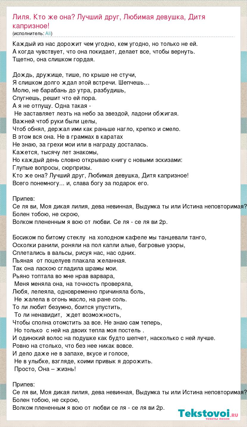 А как ты думаешь, о чем песня "Лиля. Кто же она? Лучший друг, Любимая девушка, Дитя капризное! Всего по немногу" ?