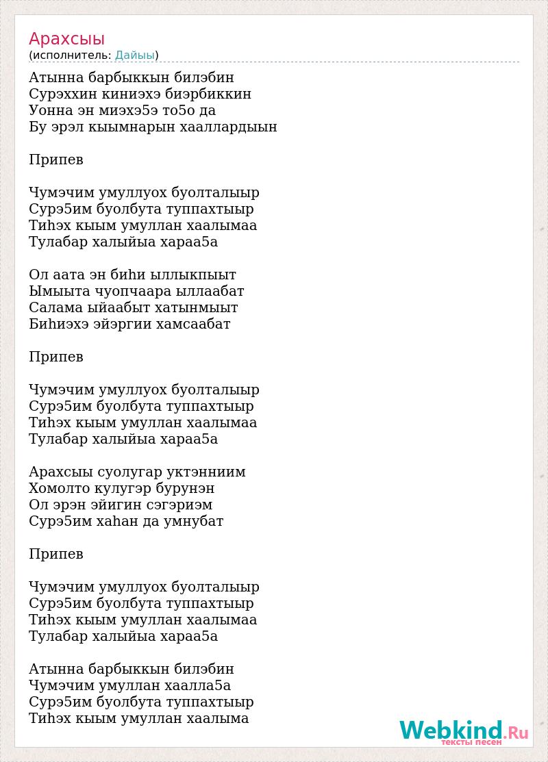 Атынна барбыккын билэбин Сурэххин киниэхэ биэрбиккин Уонна эн миэхэ5э то5о да Бу эрэл кыымнарын хааллардыын Припев Чумэчим умуллуох буолталыыр Сурэ5им буолбута туппахтыыр Тиhэх кыым умуллан хаалымаа Тулабар халыйыа хараа5а Ол аата эн биhи ыллыкпыыт Ымыыта чуопчаара ыллаабат Салама ыйаабыт хатынмыыт Биhиэхэ эйэргии хамсаабат Припев Чумэчим умуллуох буолталыыр Сурэ5им буолбута туппахтыыр Тиhэх кыым умуллан хаалымаа Тулабар халыйыа хараа5а Арахсыы суолугар уктэнниим Хомолто кулугэр бурунэн Ол эрэн эйигин сэгэриэм Сурэ5им хаhан да умнубат Припев Чумэчим умуллуох буолталыыр Сурэ5им буолбута туппахтыыр Тиhэх кыым умуллан хаалымаа Тулабар халыйыа хараа5а Атынна барбыккын билэбин Чумэчим умуллан хаалла5а Сурэ5им буолбута туппахтыыр Тиhэх кыым умуллан хаалыма