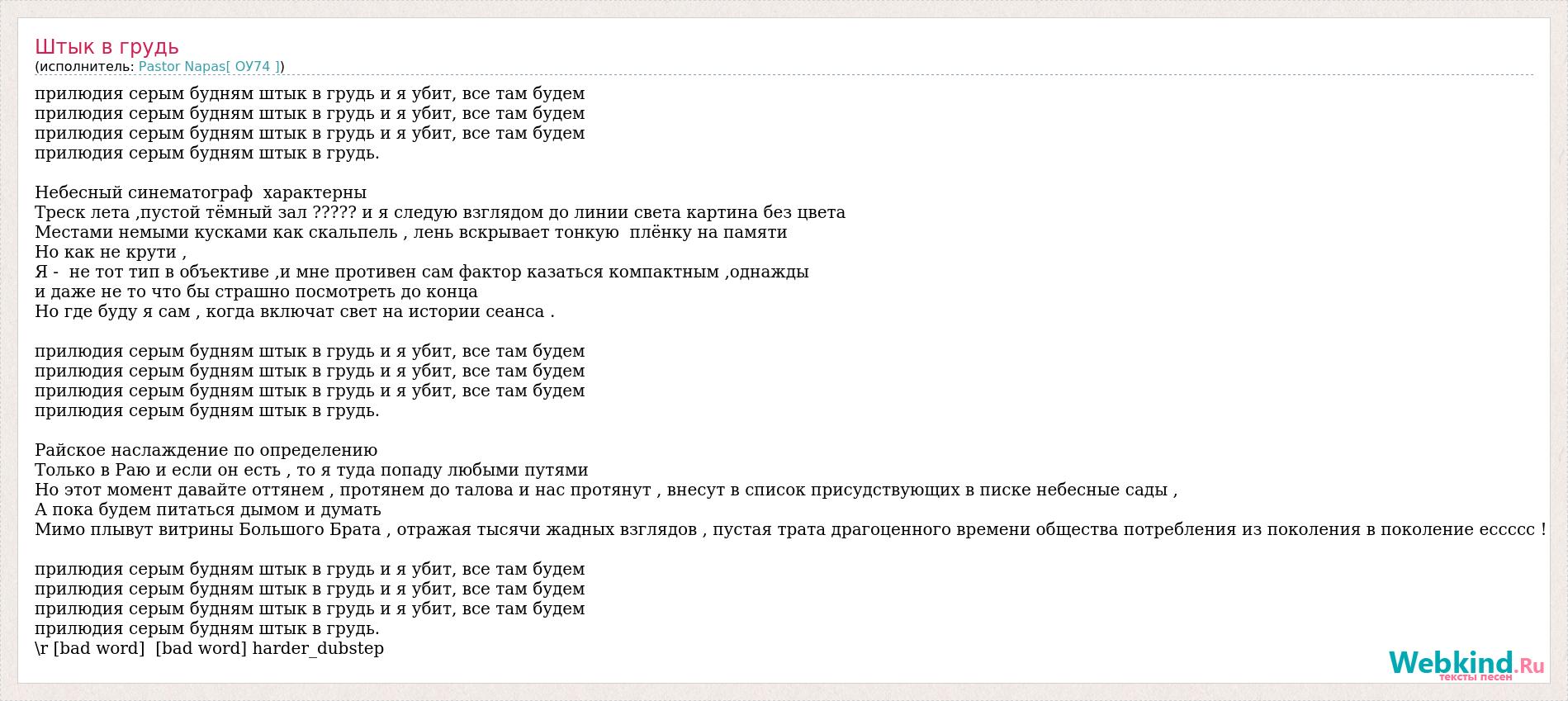 прилюдия серым будням штык в грудь и я убит, все там будем прилюдия серым будням штык в грудь и я убит, все там будем прилюдия серым будням штык в грудь и я убит, все там будем прилюдия серым будням штык в грудь. Небесный синематограф характерны Треск лета ,пустой тёмный зал ????? и я следую взглядом до линии света картина без цвета Местами немыми кусками как скальпель , лень вскрывает тонкую плёнку на памяти Но как не крути , Я - не тот тип в объективе ,и мне противен сам фактор казаться компактным ,однажды и даже не то что бы страшно посмотреть до конца Но где буду я сам , когда включат свет на истории сеанса . прилюдия серым будням штык в грудь и я убит, все там будем прилюдия серым будням штык в грудь и я убит, все там будем прилюдия серым будням штык в грудь и я убит, все там будем прилюдия серым будням штык в грудь. Райское наслаждение по определению Только в Раю и если он есть , то я туда попаду любыми путями Но этот момент давайте оттянем , протянем до талова и нас протянут , внесут в список присудствующих в писке небесные сады , А пока будем питаться дымом и думать Мимо плывут витрины Большого Брата , отражая тысячи жадных взглядов , пустая трата драгоценного времени общества потребления из поколения в поколение ессссс ! прилюдия серым будням штык в грудь и я убит, все там будем прилюдия серым будням штык в грудь и я убит, все там будем прилюдия серым будням штык в грудь и я убит, все там будем прилюдия серым будням штык в грудь. \r [bad word] [bad word] harder_dubstep