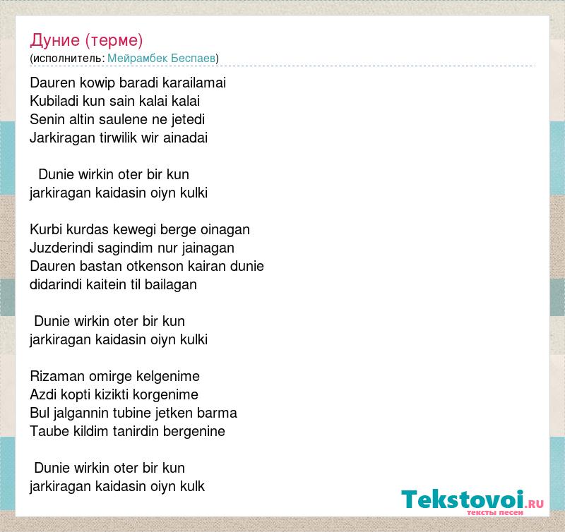 Dauren kowip baradi karailamai Kubiladi kun sain kalai kalai Senin altin saulene ne jetedi Jarkiragan tirwilik wir ainadai Dunie wirkin oter bir kun jarkiragan kaidasin oiyn kulki Kurbi kurdas kewegi berge oinagan Juzderindi sagindim nur jainagan Dauren bastan otkenson kairan dunie didarindi kaitein til bailagan Dunie wirkin oter bir kun jarkiragan kaidasin oiyn kulki Rizaman omirge kelgenime Azdi kopti kizikti korgenime Bul jalgannin tubine jetken barma Taube kildim tanirdin bergenine Dunie wirkin oter bir kun jarkiragan kaidasin oiyn kulk