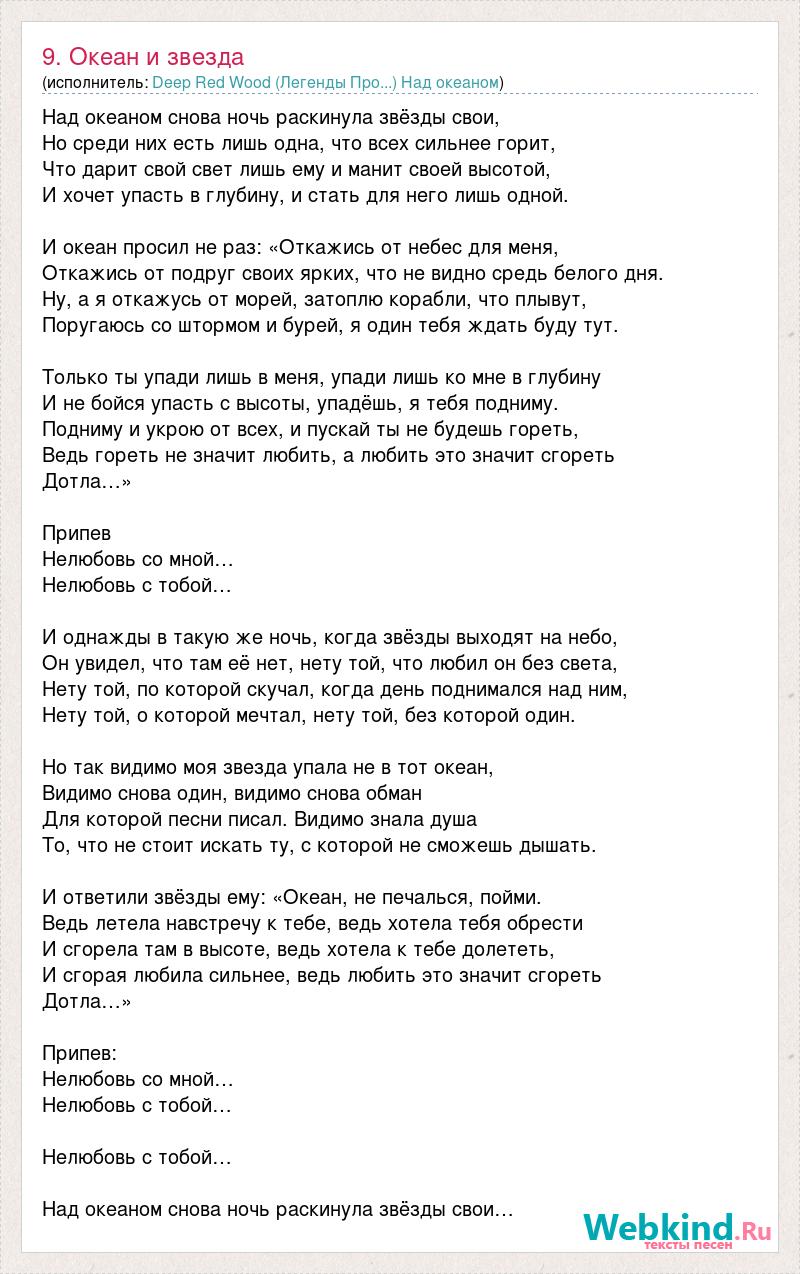 Над океаном снова ночь раскинула звёзды свои, Но среди них есть лишь одна, что всех сильнее горит, Что дарит свой свет лишь ему и манит своей высотой, И хочет упасть в глубину, и стать для него лишь одной. И океан просил не раз: «Откажись от небес для меня, Откажись от подруг своих ярких, что не видно средь белого дня. Ну, а я откажусь от морей, затоплю корабли, что плывут, Поругаюсь со штормом и бурей, я один тебя ждать буду тут. Только ты упади лишь в меня, упади лишь ко мне в глубину И не бойся упасть с высоты, упадёшь, я тебя подниму. Подниму и укрою от всех, и пускай ты не будешь гореть, Ведь гореть не значит любить, а любить это значит сгореть Дотла…» Припев Нелюбовь со мной… Нелюбовь с тобой… И однажды в такую же ночь, когда звёзды выходят на небо, Он увидел, что там её нет, нету той, что любил он без света, Нету той, по которой скучал, когда день поднимался над ним, Нету той, о которой мечтал, нету той, без которой один. Но так видимо моя звезда упала не в тот океан, Видимо снова один, видимо снова обман Для которой песни писал. Видимо знала душа То, что не стоит искать ту, с которой не сможешь дышать. И ответили звёзды ему: «Океан, не печалься, пойми. Ведь летела навстречу к тебе, ведь хотела тебя обрести И сгорела там в высоте, ведь хотела к тебе долететь, И сгорая любила сильнее, ведь любить это значит сгореть Дотла…» Припев: Нелюбовь со мной… Нелюбовь с тобой… Нелюбовь с тобой… Над океаном снова ночь раскинула звёзды свои…
