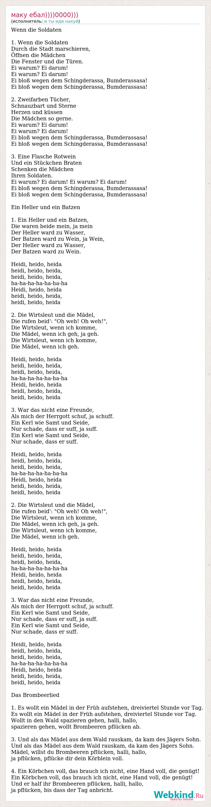 Wenn die Soldaten 1. Wenn die Soldaten Durch die Stadt marschieren, Öffnen die Mädchen Die Fenster und die Türen. Ei warum? Ei darum! Ei warum? Ei darum! Ei bloß wegen dem Schingderassa, Bumderassasa! Ei bloß wegen dem Schingderassa, Bumderassasa! 2. Zweifarben Tücher, Schnauzbart und Sterne Herzen und küssen Die Mädchen so gerne. Ei warum? Ei darum! Ei warum? Ei darum! Ei bloß wegen dem Schingderassa, Bumderassasa! Ei bloß wegen dem Schingderassa, Bumderassasa! 3. Eine Flasche Rotwein Und ein Stückchen Braten Schenken die Mädchen Ihren Soldaten. Ei warum? Ei darum! Ei warum? Ei darum! Ei bloß wegen dem Schingderassa, Bumderassasa! Ei bloß wegen dem Schingderassa, Bumderassasa! Ein Heller und ein Batzen 1. Ein Heller und ein Batzen, Die waren beide mein, ja mein Der Heller ward zu Wasser, Der Batzen ward zu Wein, ja Wein, Der Heller ward zu Wasser, Der Batzen ward zu Wein. Heidi, heido, heida heidi, heido, heida, heidi, heido, heida, ha-ha-ha-ha-ha-ha-ha Heidi, heido, heida heidi, heido, heida, heidi, heido, heida 2. Die Wirtsleut und die Mädel, Die rufen beid': "Oh weh! Oh weh!", Die Wirtsleut, wenn ich komme, Die Mädel, wenn ich geh, ja geh. Die Wirtsleut, wenn ich komme, Die Mädel, wenn ich geh. Heidi, heido, heida heidi, heido, heida, heidi, heido, heida, ha-ha-ha-ha-ha-ha-ha Heidi, heido, heida heidi, heido, heida, heidi, heido, heida 3. War das nicht eine Freunde, Als mich der Herrgott schuf, ja schuff. Ein Kerl wie Samt und Seide, Nur schade, dass er suff, ja suff. Ein Kerl wie Samt und Seide, Nur schade, dass er suff. Heidi, heido, heida heidi, heido, heida, heidi, heido, heida, ha-ha-ha-ha-ha-ha-ha Heidi, heido, heida heidi, heido, heida, heidi, heido, heida 2. Die Wirtsleut und die Mädel, Die rufen beid': "Oh weh! Oh weh!", Die Wirtsleut, wenn ich komme, Die Mädel, wenn ich geh, ja geh. Die Wirtsleut, wenn ich komme, Die Mädel, wenn ich geh. Heidi, heido, heida heidi, heido, heida, heidi, heido, heida, ha-ha-ha-ha-ha-ha-ha Heidi, heido, heida heidi, heido, heida, heidi, heido, heida 3. War das nicht eine Freunde, Als mich der Herrgott schuf, ja schuff. Ein Kerl wie Samt und Seide, Nur schade, dass er suff, ja suff. Ein Kerl wie Samt und Seide, Nur schade, dass er suff. Heidi, heido, heida heidi, heido, heida, heidi, heido, heida, ha-ha-ha-ha-ha-ha-ha Heidi, heido, heida heidi, heido, heida, heidi, heido, heida Das Brombeerlied 1. Es wollt ein Mädel in der Früh aufstehen, dreiviertel Stunde vor Tag. Es wollt ein Mädel in der Früh aufstehen, dreiviertel Stunde vor Tag. Wollt in den Wald spazieren gehen, halli, hallo, spazieren gehen, wollt Brombeeren pflücken ab. 3. Und als das Mädel aus dem Wald rauskam, da kam des Jägers Sohn. Und als das Mädel aus dem Wald rauskam, da kam des Jägers Sohn. Mädel, willst du Brombeeren pflücken, halli, hallo, ja pflücken, pflücke dir dein Körblein voll. 4. Ein Körbchen voll, das brauch ich nicht, eine Hand voll, die genügt! Ein Körbchen voll, das brauch ich nicht, eine Hand voll, die genügt! Und er half ihr Brombeeren pflücken, halli, hallo, ja pflücken, bis dass der Tag anbricht.