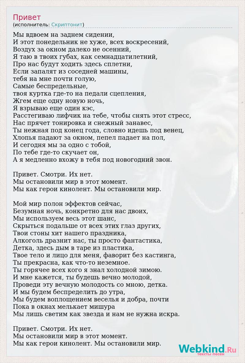 Мы вдвоем на заднем сидении, И этот понедельник не хуже, всех воскресений, Воздух за окном далеко не осенний, Я таю в твоих губах, как семнадцатилетний, Про нас будут ходить здесь сплетни, Если запалят из соседней машины, тебя на мне почти голую, Самые беспредельные, твоя куртка где-то на педали сцепления, Жгем еще одну новую ночь, Я взрываю еще один кэс, Расстегиваю лифчик на тебе, чтобы снять этот стресс, Нас прячет тонировка и снежный занавес, Ты нежная под конец года, словно идешь под венец, Хлопья падают за окном, пепел падает на пол, И сегодня мы за одно с тобой, По тебе где-то скучает он, А я медленно вхожу в тебя под новогодний звон. Привет. Смотри. Их нет. Мы остановили мир в этот момент. Мы как герои кинолент. Мы остановили мир. Мой мир полон эффектов сейчас, Безумная ночь, конкретно для нас двоих, Мы используем весь этот шанс, Скрыться подальше от всех этих глаз других, Твои стоны хит нашего праздника, Алкоголь дразнит нас, ты просто фантастика, Детка, здесь дым в таре из пластика, Твое тело и лицо для меня, фаворит без кастинга, Ты прекрасна, как что-то неземное. Ты горячее всех кого я знал холодной зимою. И мне кажется, ты будешь вечно молодой, Проведи эту вечную молодость со мною, детка. И мы будем беспределить до утра, Мы будем воплощением веселья и добра, почти Пока в окнах мелькает мишура Мы лишь светим как звезда и нам не нужна искра. Привет. Смотри. Их нет. Мы остановили мир в этот момент. Мы как герои кинолент. Мы остановили мир.