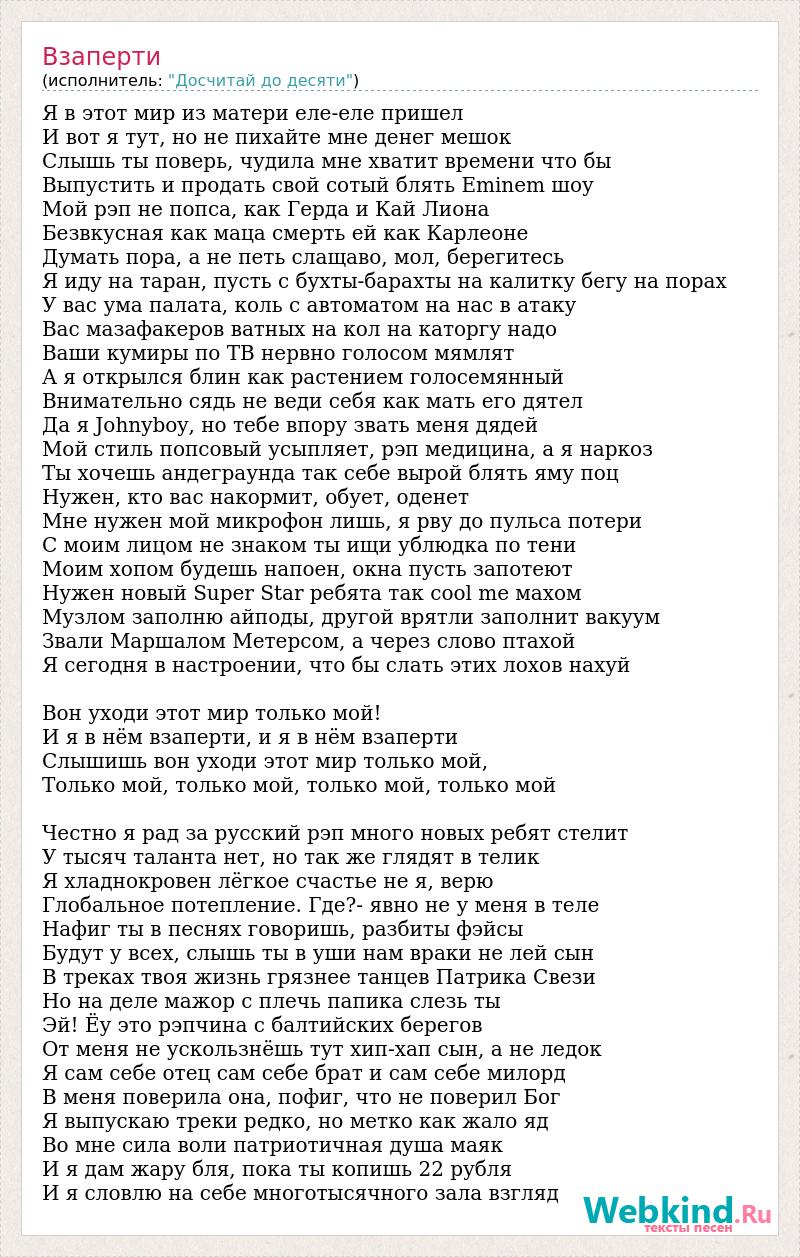 Я в этот мир из матери еле-еле пришел И вот я тут, но не пихайте мне денег мешок Слышь ты поверь, чудила мне хватит времени что бы Выпустить и продать свой сотый блять Eminem шоу Мой рэп не попса, как Герда и Кай Лиона Безвкусная как маца смерть ей как Карлеоне Думать пора, а не петь слащаво, мол, берегитесь Я иду на таран, пусть с бухты-барахты на калитку бегу на порах У вас ума палата, коль с автоматом на нас в атаку Вас мазафакеров ватных на кол на каторгу надо Ваши кумиры по ТВ нервно голосом мямлят А я открылся блин как растением голосемянный Внимательно сядь не веди себя как мать его дятел Да я Johnyboy, но тебе впору звать меня дядей Мой стиль попсовый усыпляет, рэп медицина, а я наркоз Ты хочешь андеграунда так себе вырой блять яму поц Нужен, кто вас накормит, обует, оденет Мне нужен мой микрофон лишь, я рву до пульса потери С моим лицом не знаком ты ищи ублюдка по тени Моим хопом будешь напоен, окна пусть запотеют Нужен новый Super Star ребята так cool me махом Музлом заполню айподы, другой врятли заполнит вакуум Звали Маршалом Метерсом, а через слово птахой Я сегодня в настроении, что бы слать этих лохов нахуй Вон уходи этот мир только мой! И я в нём взаперти, и я в нём взаперти Слышишь вон уходи этот мир только мой, Только мой, только мой, только мой, только мой Честно я рад за русский рэп много новых ребят стелит У тысяч таланта нет, но так же глядят в телик Я хладнокровен лёгкое счастье не я, верю Глобальное потепление. Где?- явно не у меня в теле Нафиг ты в песнях говоришь, разбиты фэйсы Будут у всех, слышь ты в уши нам враки не лей сын В треках твоя жизнь грязнее танцев Патрика Свези Но на деле мажор с плечь папика слезь ты Эй! Ёу это рэпчина с балтийских берегов От меня не ускользнёшь тут хип-хап сын, а не ледок Я сам себе отец сам себе брат и сам себе милорд В меня поверила она, пофиг, что не поверил Бог Я выпускаю треки редко, но метко как жало яд Во мне сила воли патриотичная душа маяк И я дам жару бля, пока ты копишь 22 рубля И я словлю на себе многотысячного зала взгляд