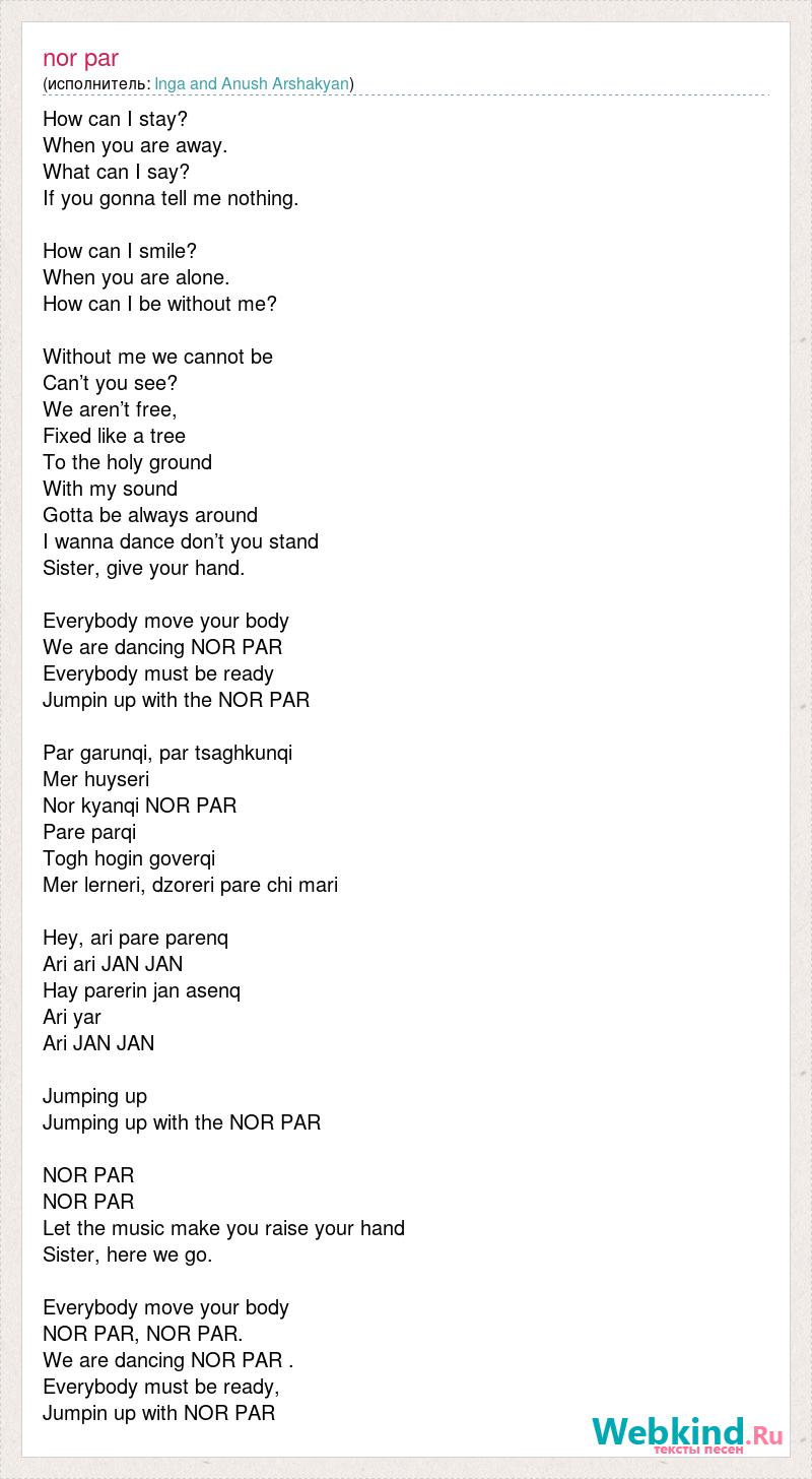 How can I stay? When you are away. What can I say? If you gonna tell me nothing. How can I smile? When you are alone. How can I be without me? Without me we cannot be Can’t you see? We aren’t free, Fixed like a tree To the holy ground With my sound Gotta be always around I wanna dance don’t you stand Sister, give your hand. Everybody move your body We are dancing NOR PAR Everybody must be ready Jumpin up with the NOR PAR Par garunqi, par tsaghkunqi Mer huyseri Nor kyanqi NOR PAR Pare parqi Togh hogin goverqi Mer lerneri, dzoreri pare chi mari Hey, ari pare parenq Ari ari JAN JAN Hay parerin jan asenq Ari yar Ari JAN JAN Jumping up Jumping up with the NOR PAR NOR PAR NOR PAR Let the music make you raise your hand Sister, here we go. Everybody move your body NOR PAR, NOR PAR. We are dancing NOR PAR . Everybody must be ready, Jumpin up with NOR PAR