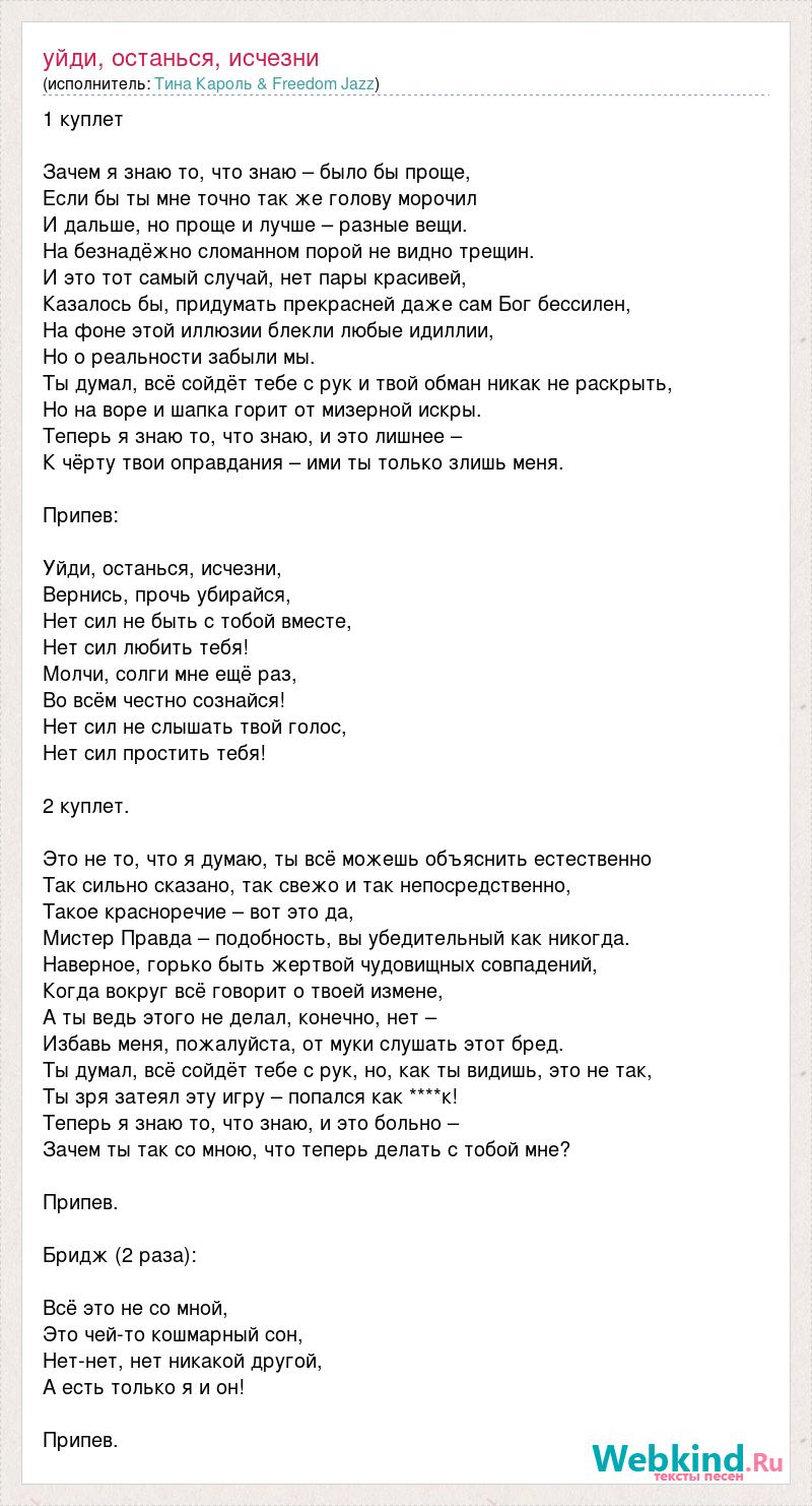 1 куплет Зачем я знаю то, что знаю – было бы проще, Если бы ты мне точно так же голову морочил И дальше, но проще и лучше – разные вещи. На безнадёжно сломанном порой не видно трещин. И это тот самый случай, нет пары красивей, Казалось бы, придумать прекрасней даже сам Бог бессилен, На фоне этой иллюзии блекли любые идиллии, Но о реальности забыли мы. Ты думал, всё сойдёт тебе с рук и твой обман никак не раскрыть, Но на воре и шапка горит от мизерной искры. Теперь я знаю то, что знаю, и это лишнее – К чёрту твои оправдания – ими ты только злишь меня. Припев: Уйди, останься, исчезни, Вернись, прочь убирайся, Нет сил не быть с тобой вместе, Нет сил любить тебя! Молчи, солги мне ещё раз, Во всём честно сознайся! Нет сил не слышать твой голос, Нет сил простить тебя! 2 куплет. Это не то, что я думаю, ты всё можешь объяснить естественно Так сильно сказано, так свежо и так непосредственно, Такое красноречие – вот это да, Мистер Правда – подобность, вы убедительный как никогда. Наверное, горько быть жертвой чудовищных совпадений, Когда вокруг всё говорит о твоей измене, А ты ведь этого не делал, конечно, нет – Избавь меня, пожалуйста, от муки слушать этот бред. Ты думал, всё сойдёт тебе с рук, но, как ты видишь, это не так, Ты зря затеял эту игру – попался как ****к! Теперь я знаю то, что знаю, и это больно – Зачем ты так со мною, что теперь делать с тобой мне? Припев. Бридж (2 раза): Всё это не со мной, Это чей-то кошмарный сон, Нет-нет, нет никакой другой, А есть только я и он! Припев.