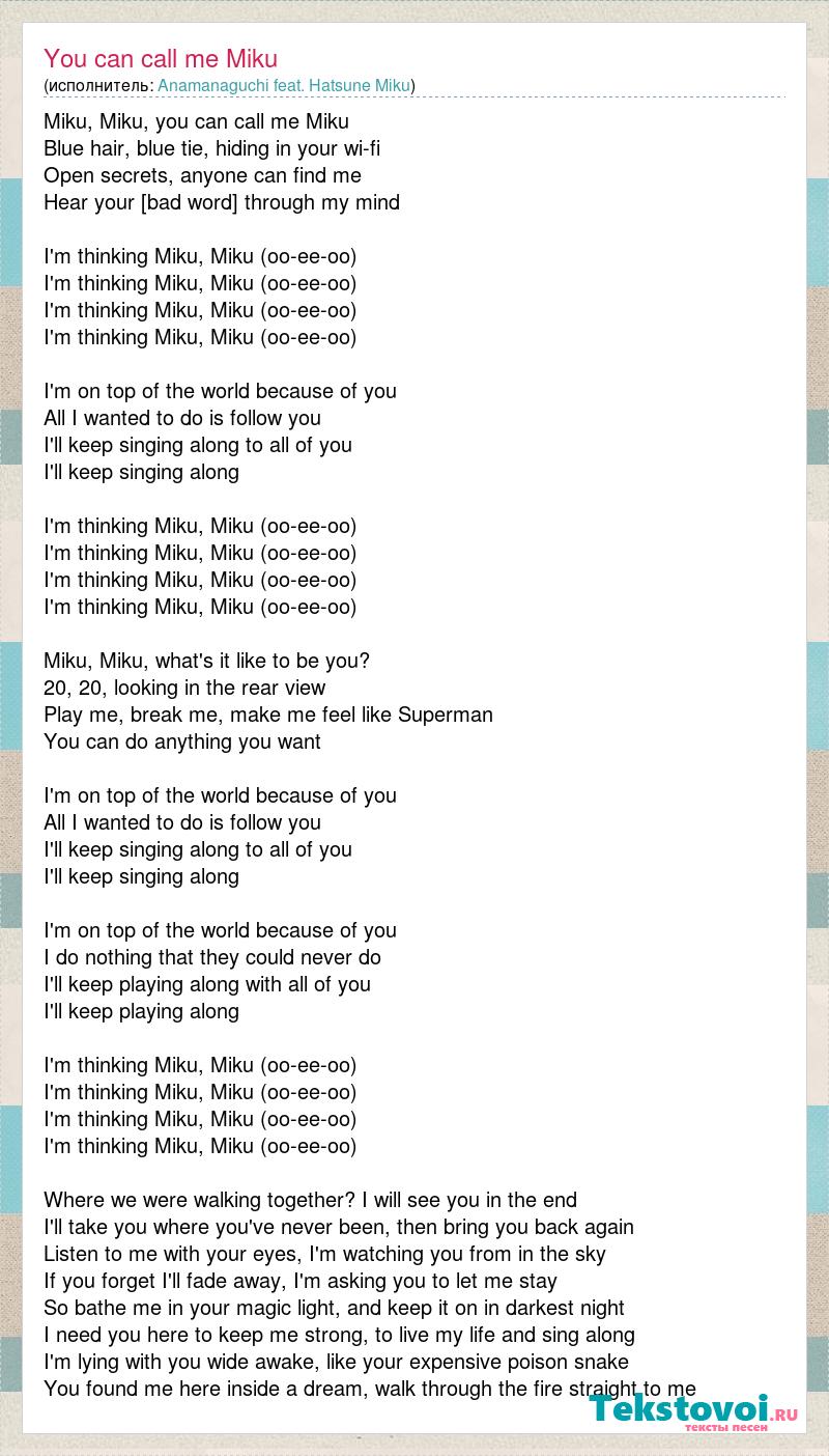 Miku, Miku, you can call me Miku Blue hair, blue tie, hiding in your wi-fi Open secrets, anyone can find me Hear your music running through my mind I'm thinking Miku, Miku (oo-ee-oo) I'm thinking Miku, Miku (oo-ee-oo) I'm thinking Miku, Miku (oo-ee-oo) I'm thinking Miku, Miku (oo-ee-oo) I'm on top of the world because of you All I wanted to do is follow you I'll keep singing along to all of you I'll keep singing along I'm thinking Miku, Miku (oo-ee-oo) I'm thinking Miku, Miku (oo-ee-oo) I'm thinking Miku, Miku (oo-ee-oo) I'm thinking Miku, Miku (oo-ee-oo) Miku, Miku, what's it like to be you? 20, 20, looking in the rear view Play me, break me, make me feel like Superman You can do anything you want I'm on top of the world because of you All I wanted to do is follow you I'll keep singing along to all of you I'll keep singing along I'm on top of the world because of you I do nothing that they could never do I'll keep playing along with all of you I'll keep playing along I'm thinking Miku, Miku (oo-ee-oo) I'm thinking Miku, Miku (oo-ee-oo) I'm thinking Miku, Miku (oo-ee-oo) I'm thinking Miku, Miku (oo-ee-oo) Where we were walking together? I will see you in the end I'll take you where you've never been, then bring you back again Listen to me with your eyes, I'm watching you from in the sky If you forget I'll fade away, I'm asking you to let me stay So bathe me in your magic light, and keep it on in darkest night I need you here to keep me strong, to live my life and sing along I'm lying with you wide awake, like your expensive poison snake You found me here inside a dream, walk through the fire straight to me