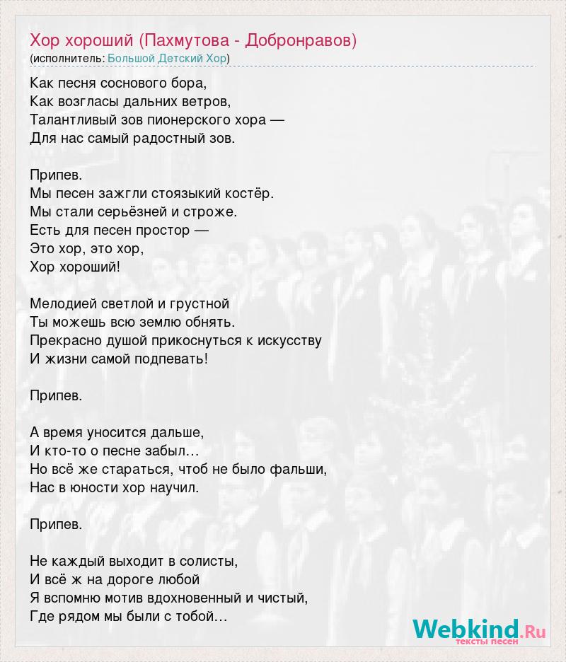 Как песня соснового бора, Как возгласы дальних ветров, Талантливый зов пионерского хора — Для нас самый радостный зов. Припев. Мы песен зажгли стоязыкий костёр. Мы стали серьёзней и строже. Есть для песен простор — Это хор, это хор, Хор хороший! Мелодией светлой и грустной Ты можешь всю землю обнять. Прекрасно душой прикоснуться к искусству И жизни самой подпевать! Припев. А время уносится дальше, И кто-то о песне забыл… Но всё же стараться, чтоб не было фальши, Нас в юности хор научил. Припев. Не каждый выходит в солисты, И всё ж на дороге любой Я вспомню мотив вдохновенный и чистый, Где рядом мы были с тобой…