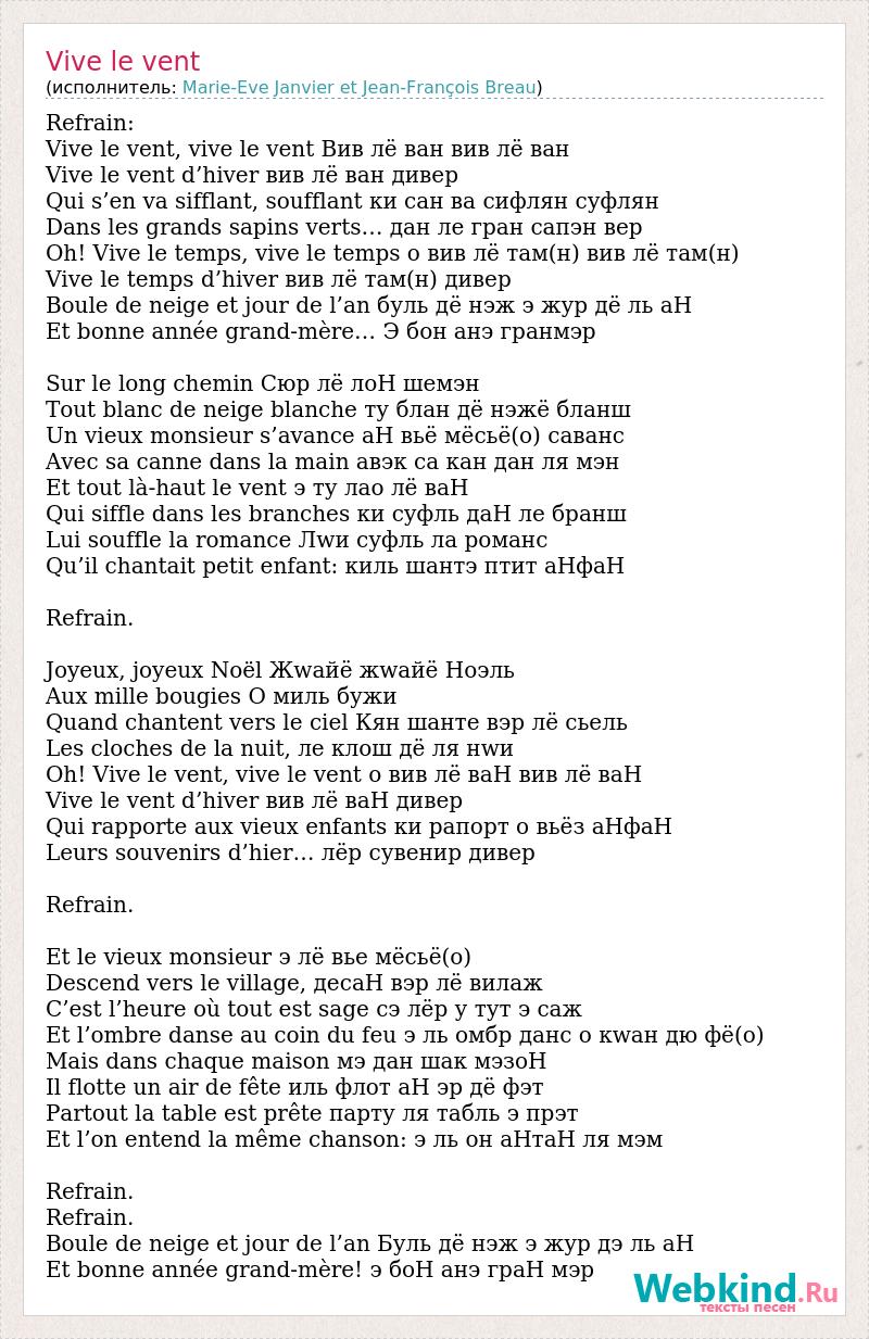 Refrain: Vive le vent, vive le vent Вив лё ван вив лё ван Vive le vent d’hiver вив лё ван дивер Qui s’en va sifflant, soufflant ки сан ва сифлян суфлян Dans les grands sapins verts… дан ле гран сапэн вер Oh! Vive le temps, vive le temps о вив лё там(н) вив лё там(н) Vive le temps d’hiver вив лё там(н) дивер Boule de neige et jour de l’an буль дё нэж э жур дё ль аН Et bonne année grand-mère… Э бон анэ гранмэр Sur le long chemin Сюр лё лоН шемэн Tout blanc de neige blanche ту блан дё нэжё бланш Un vieux monsieur s’avance аН вьё мёсьё(о) саванс Avec sa canne dans la main авэк са кан дан ля мэн Et tout là-haut le vent э ту лао лё ваН Qui siffle dans les branches ки суфль даН ле бранш Lui souffle la romance Лwи суфль ла романс Qu’il chantait petit enfant: киль шантэ птит аНфаН Refrain. Joyeux, joyeux Noël Жwайё жwайё Ноэль Aux mille bougies О миль бужи Quand chantent vers le ciel Кян шанте вэр лё сьель Les cloches de la nuit, ле клош дё ля нwи Oh! Vive le vent, vive le vent о вив лё ваН вив лё ваН Vive le vent d’hiver вив лё ваН дивер Qui rapporte aux vieux enfants ки рапорт о вьёз аНфаН Leurs souvenirs d’hier… лёр сувенир дивер Refrain. Et le vieux monsieur э лё вье мёсьё(о) Descend vers le village, десаН вэр лё вилаж C’est l’heure où tout est sage сэ лёр у тут э саж Et l’ombre danse au coin du feu э ль омбр данс о кwaн дю фё(о) Mais dans chaque maison мэ дан шак мэзоН Il flotte un air de fête иль флот аН эр дё фэт Partout la table est prête парту ля табль э прэт Et l’on entend la même chanson: э ль он аНтаН ля мэм Refrain. Refrain. Boule de neige et jour de l’an Буль дё нэж э жур дэ ль аН Et bonne année grand-mère! э боН анэ граН мэр