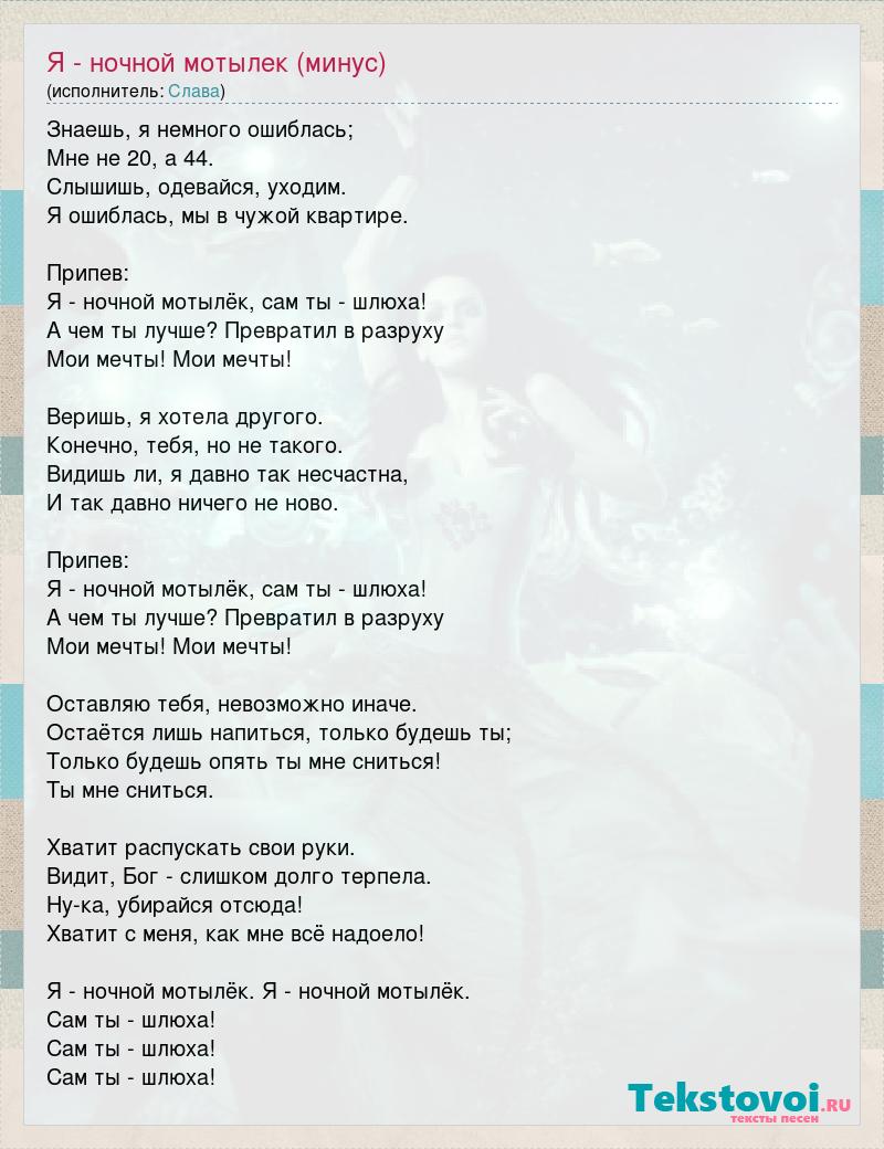 Знаешь, я немного ошиблась; Мне не 20, а 44. Слышишь, одевайся, уходим. Я ошиблась, мы в чужой квартире. Припев: Я - ночной мотылёк, сам ты - шлюха! А чем ты лучше? Превратил в разруху Мои мечты! Мои мечты! Веришь, я хотела другого. Конечно, тебя, но не такого. Видишь ли, я давно так несчастна, И так давно ничего не ново. Припев: Я - ночной мотылёк, сам ты - шлюха! А чем ты лучше? Превратил в разруху Мои мечты! Мои мечты! Оставляю тебя, невозможно иначе. Остаётся лишь напиться, только будешь ты; Только будешь опять ты мне сниться! Ты мне сниться. Хватит распускать свои руки. Видит, Бог - слишком долго терпела. Ну-ка, убирайся отсюда! Хватит с меня, как мне всё надоело! Я - ночной мотылёк. Я - ночной мотылёк. Сам ты - шлюха! Сам ты - шлюха! Сам ты - шлюха!