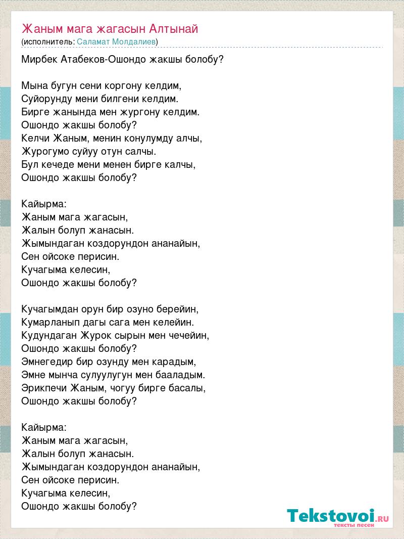 Мирбек Атабеков-Ошондо жакшы болобу? Мына бугун сени коргону келдим, Суйорунду мени билгени келдим. Бирге жанында мен жургону келдим. Ошондо жакшы болобу? Келчи Жаным, менин конулумду алчы, Журогумо суйуу отун салчы. Бул кечеде мени менен бирге калчы, Ошондо жакшы болобу? Кайырма: Жаным мага жагасын, Жалын болуп жанасын. Жымындаган коздорундон ананайын, Сен ойсоке перисин. Кучагыма келесин, Ошондо жакшы болобу? Кучагымдан орун бир озуно берейин, Кумарланып дагы сага мен келейин. Кудундаган Журок сырын мен чечейин, Ошондо жакшы болобу? Эмнегедир бир озунду мен карадым, Эмне мынча сулуулугун мен бааладым. Эрикпечи Жаным, чогуу бирге басалы, Ошондо жакшы болобу? Кайырма: Жаным мага жагасын, Жалын болуп жанасын. Жымындаган коздорундон ананайын, Сен ойсоке перисин. Кучагыма келесин, Ошондо жакшы болобу?