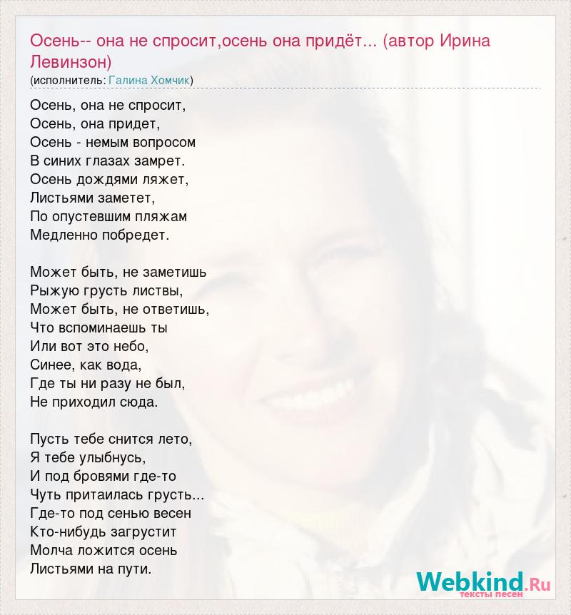 А как ты думаешь, о чем песня "Осень-- она не спросит,осень она придёт... (автор Ирина Левинзон)" ?