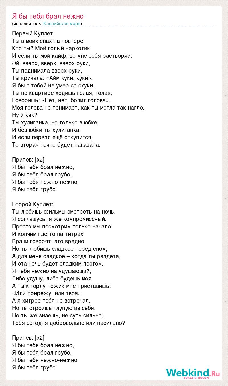Первый Куплет: Ты в моих снах на повторе, Кто ты? Мой голый наркотик. И если ты мой кайф, во мне себя растворяй. Эй, вверх, вверх, вверх руки, Ты поднимала вверх руки, Ты кричала: «Айм куки, куки», Я бы с тобой не умер со скуки. Ты по квартире ходишь голая, голая, Говоришь: «Нет, нет, болит голова». Моя голова не понимает, как ты могла так нагло, Ну и как? Ты хулиганка, но только в юбке, И без юбки ты хулиганка. И если первая ещё откупится, То вторая точно будет наказана. Припев: [х2] Я бы тебя брал нежно, Я бы тебя брал грубо, Я бы тебя нежно-нежно, Я бы тебя грубо. Второй Куплет: Ты любишь фильмы смотреть на ночь, Я соглашусь, я же компромиссный. Просто мы посмотрим только начало И кончим где-то на титрах. Врачи говорят, это вредно, Но ты любишь сладкое перед сном, А для меня сладкое – когда ты раздета, И эта ночь будет сладким постом. Я тебя нежно на удушающий, Либо удушу, либо будешь моя. А ты к горлу ножик мне приставишь: «Или прирежу, или твоя». А я хитрее тебя не встречал, Но ты строишь глупую из себя, Но ты же знаешь, не суть сильно, Тебя сегодня добровольно или насильно? Припев: [х2] Я бы тебя брал нежно, Я бы тебя брал грубо, Я бы тебя нежно-нежно, Я бы тебя грубо.