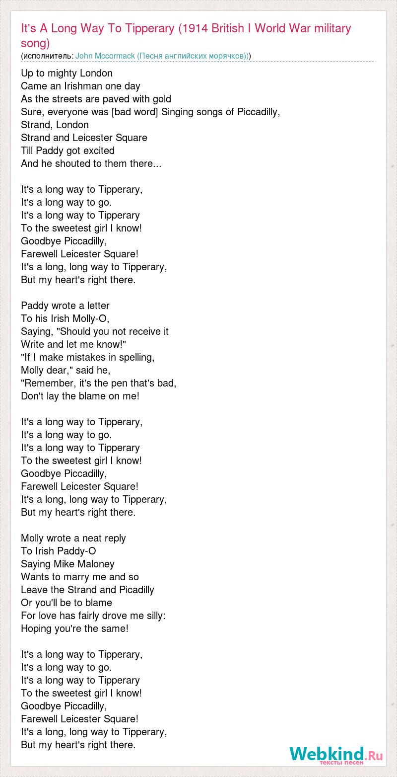 Up to mighty London Came an Irishman one day As the streets are paved with gold Sure, everyone was [bad word] Singing songs of Piccadilly, Strand, London Strand and Leicester Square Till Paddy got excited And he shouted to them there... It's a long way to Tipperary, It's a long way to go. It's a long way to Tipperary To the sweetest girl I know! Goodbye Piccadilly, Farewell Leicester Square! It's a long, long way to Tipperary, But my heart's right there. Paddy wrote a letter To his Irish Molly-O, Saying, "Should you not receive it Write and let me know!" "If I make mistakes in spelling, Molly dear," said he, "Remember, it's the pen that's bad, Don't lay the blame on me! It's a long way to Tipperary, It's a long way to go. It's a long way to Tipperary To the sweetest girl I know! Goodbye Piccadilly, Farewell Leicester Square! It's a long, long way to Tipperary, But my heart's right there. Molly wrote a neat reply To Irish Paddy-O Saying Mike Maloney Wants to marry me and so Leave the Strand and Picadilly Or you'll be to blame For love has fairly drove me silly: Hoping you're the same! It's a long way to Tipperary, It's a long way to go. It's a long way to Tipperary To the sweetest girl I know! Goodbye Piccadilly, Farewell Leicester Square! It's a long, long way to Tipperary, But my heart's right there.