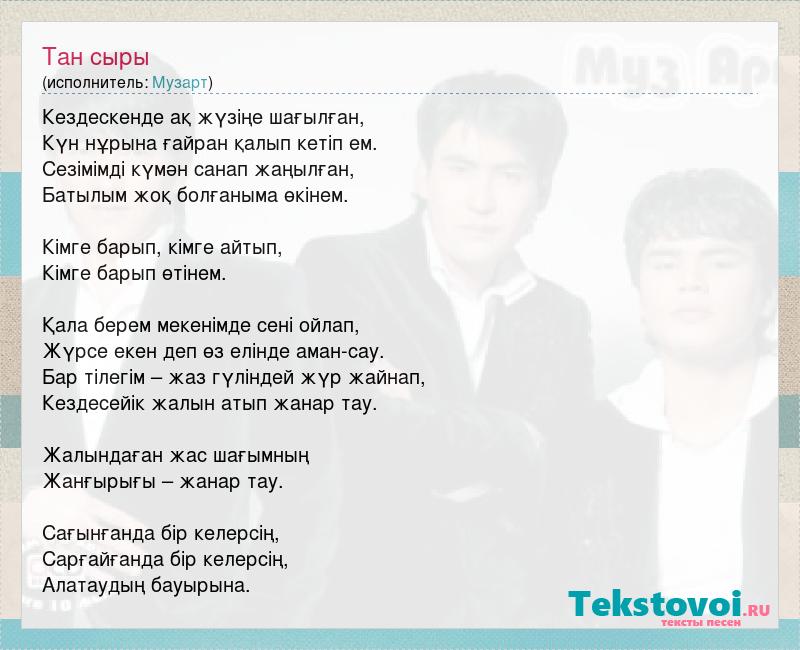 Кездескенде ақ жүзіңе шағылған, Күн нұрына ғайран қалып кетіп ем. Сезімімді күмән санап жаңылған, Батылым жоқ болғаныма өкінем. Кімге барып, кімге айтып, Кімге барып өтінем. Қала берем мекенімде сені ойлап, Жүрсе екен деп өз елінде аман-сау. Бар тілегім – жаз гүліндей жүр жайнап, Кездесейік жалын атып жанар тау. Жалындаған жас шағымның Жанғырығы – жанар тау. Сағынғанда бір келерсің, Сарғайғанда бір келерсің, Алатаудың бауырына.