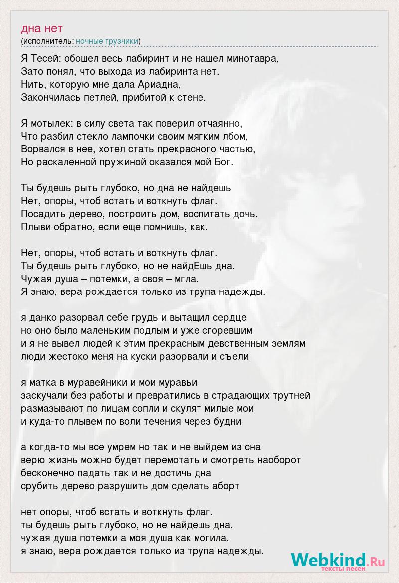 Я Тесей: обошел весь лабиринт и не нашел минотавра, Зато понял, что выхода из лабиринта нет. Нить, которую мне дала Ариадна, Закончилась петлей, прибитой к стене. Я мотылек: в силу света так поверил отчаянно, Что разбил стекло лампочки своим мягким лбом, Ворвался в нее, хотел стать прекрасного частью, Но раскаленной пружиной оказался мой Бог. Ты будешь рыть глубоко, но дна не найдешь Нет, опоры, чтоб встать и воткнуть флаг. Посадить дерево, построить дом, воспитать дочь. Плыви обратно, если еще помнишь, как. Нет, опоры, чтоб встать и воткнуть флаг. Ты будешь рыть глубоко, но не найдЕшь дна. Чужая душа – потемки, а своя – мгла. Я знаю, вера рождается только из трупа надежды. я данко разорвал себе грудь и вытащил сердце но оно было маленьким подлым и уже сгоревшим и я не вывел людей к этим прекрасным девственным землям люди жестоко меня на куски разорвали и съели я матка в муравейники и мои муравьи заскучали без работы и превратились в страдающих трутней размазывают по лицам сопли и скулят милые мои и куда-то плывем по воли течения через будни а когда-то мы все умрем но так и не выйдем из сна верю жизнь можно будет перемотать и смотреть наоборот бесконечно падать так и не достичь дна срубить дерево разрушить дом сделать аборт нет опоры, чтоб встать и воткнуть флаг. ты будешь рыть глубоко, но не найдешь дна. чужая душа потемки а моя душа как могила. я знаю, вера рождается только из трупа надежды.