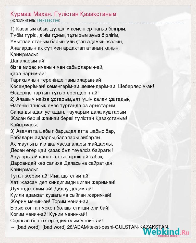 1) Қазағым абыз дүлділім,кеменгер нағыз білгірім, Түбім түрік, дінім тұнық тұғырым ауыз бірлігім, Ұмытпай отаным барын ұлықтап адамын жалын, Аналардың ақ сүтімен ардақтап атаның қанын Қайырмасы: Даналарым-ай! бізге мирас иманың мен сабырларың-ай, қара нарым-ай! Тарихымның тереңінде тамырларың-ай Көсемдерім-ай! кеменгерім-ай!шешендерім-ай! Шеберлерім-ай! Өздеріңе тартып тұғыр өрендерің-ай! 2) Алашым найза ұстарым,ұлт үшін қалам ұштадың Өзгенікі тансык емес турганда оз арыстарым Сананды адал устадын, тауларым дала куштарым Жасай берші жайнай берші гүлістан Қазақстаным! Қайырмасы: 3) Азаматта шабыт бар,адал атта шабыс бар, Бабалары айдарлы,балалары айбарлы, Ақ жаулығы кір шалмас,аналары жайдарлы, Десен егер қай қазақ бұл тәуелсіз байрағы! Арулары ай қанат алтын кірпік ай қабақ Дархандай кез салиха Даласына сайратқан! Кайырмасы: Туган жерим-ай! Иманды елим-ай! Хат жазсам деп киндигимди киган жерим-ай! Думанды елим-ай! Дидау дедим-ай! Кулли адамзат кушагыма сыйган жерим-ай! Жерим менин-ай! Торим менин-ай! Ырыс конган мекен болшы егинди ели бай! Когим менин-ай! Куним менин-ай! Садаган боп кетер едим елим менин-ай! → [bad word] [bad word] 28/ADAM/tekst-pesni-GULSTAN-KAZAKSTAN