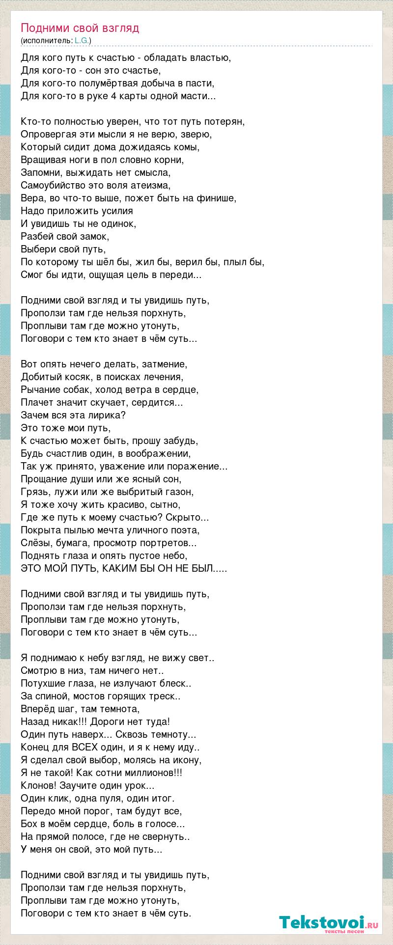 Для кого путь к счастью - обладать властью, Для кого-то - сон это счастье, Для кого-то полумёртвая добыча в пасти, Для кого-то в руке 4 карты одной масти... Кто-то полностью уверен, что тот путь потерян, Опровергая эти мысли я не верю, зверю, Который сидит дома дожидаясь комы, Вращивая ноги в пол словно корни, Запомни, выжидать нет смысла, Самоубийство это воля атеизма, Вера, во что-то выше, пожет быть на финише, Надо приложить усилия И увидишь ты не одинок, Разбей свой замок, Выбери свой путь, По которому ты шёл бы, жил бы, верил бы, плыл бы, Смог бы идти, ощущая цель в переди... Подними свой взгляд и ты увидишь путь, Проползи там где нельзя порхнуть, Проплыви там где можно утонуть, Поговори с тем кто знает в чём суть... Вот опять нечего делать, затмение, Добитый косяк, в поисках лечения, Рычание собак, холод ветра в сердце, Плачет значит скучает, сердится... Зачем вся эта лирика? Это тоже мои путь, К счастью может быть, прошу забудь, Будь счастлив один, в воображении, Так уж принято, уважение или поражение... Прощание души или же ясный сон, Грязь, лужи или же выбритый газон, Я тоже хочу жить красиво, сытно, Где же путь к моему счастью? Скрыто... Покрыта пылью мечта уличного поэта, Слёзы, бумага, просмотр портретов... Поднять глаза и опять пустое небо, ЭТО МОЙ ПУТЬ, КАКИМ БЫ ОН НЕ БЫЛ..... Подними свой взгляд и ты увидишь путь, Проползи там где нельзя порхнуть, Проплыви там где можно утонуть, Поговори с тем кто знает в чём суть... Я поднимаю к небу взгляд, не вижу свет.. Смотрю в низ, там ничего нет.. Потухшие глаза, не излучают блеск.. За спиной, мостов горящих треск.. Вперёд шаг, там темнота, Назад никак!!! Дороги нет туда! Один путь наверх... Сквозь темноту... Конец для ВСЕХ один, и я к нему иду.. Я сделал свой выбор, молясь на икону, Я не такой! Как сотни миллионов!!! Клонов! Заучите один урок... Один клик, одна пуля, один итог. Передо мной порог, там будут все, Бох в моём сердце, боль в голосе... На прямой полосе, где не свернуть.. У меня он свой, это мой путь... Подними свой взгляд и ты увидишь путь, Проползи там где нельзя порхнуть, Проплыви там где можно утонуть, Поговори с тем кто знает в чём суть.