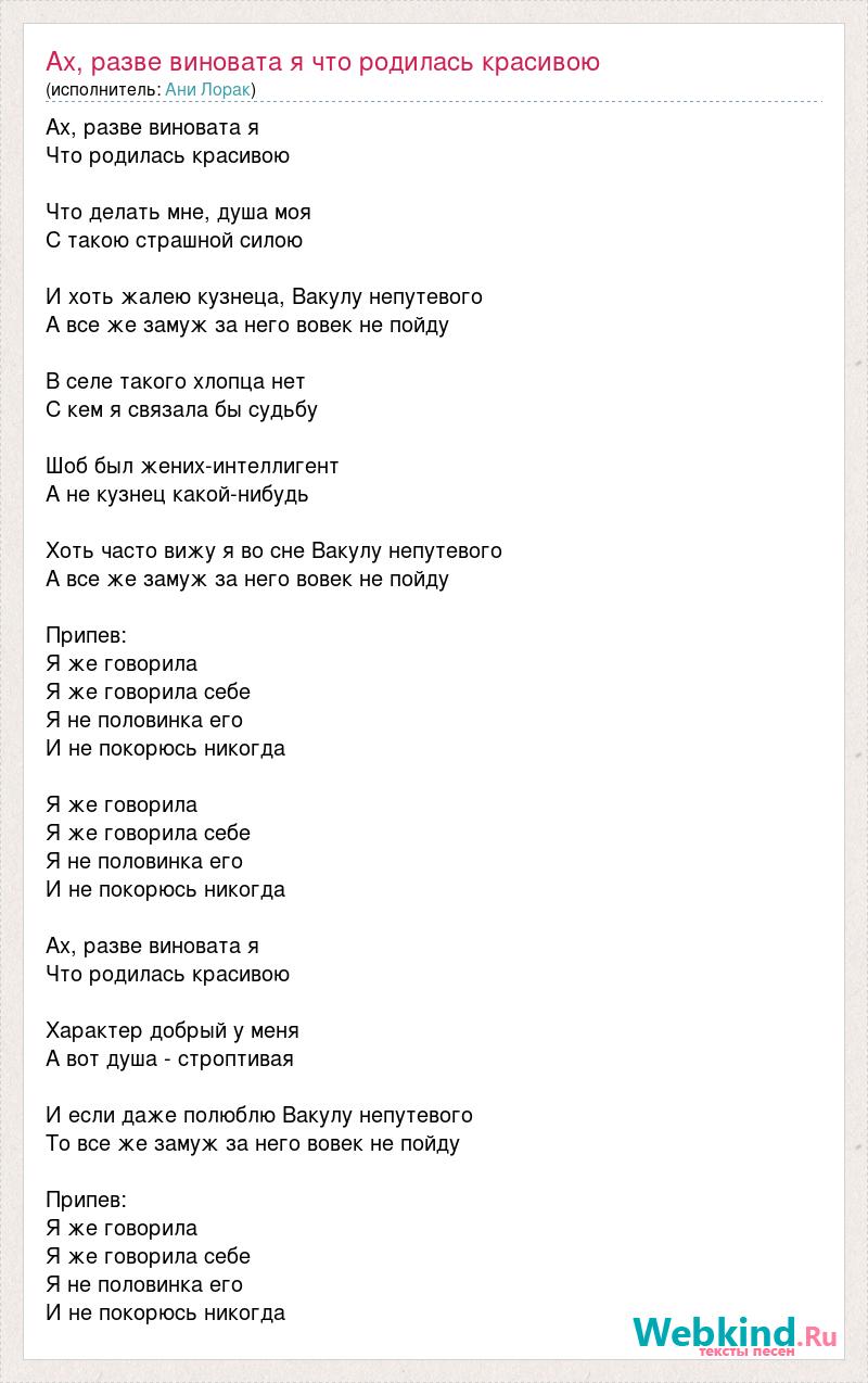 Ах, разве виновата я Что родилась красивою Что делать мне, душа моя С такою страшной силою И хоть жалею кузнеца, Вакулу непутевого А все же замуж за него вовек не пойду В селе такого хлопца нет С кем я связала бы судьбу Шоб был жених-интеллигент А не кузнец какой-нибудь Хоть часто вижу я во сне Вакулу непутевого А все же замуж за него вовек не пойду Припев: Я же говорила Я же говорила себе Я не половинка его И не покорюсь никогда Я же говорила Я же говорила себе Я не половинка его И не покорюсь никогда Ах, разве виновата я Что родилась красивою Характер добрый у меня А вот душа - строптивая И если даже полюблю Вакулу непутевого То все же замуж за него вовек не пойду Припев: Я же говорила Я же говорила себе Я не половинка его И не покорюсь никогда