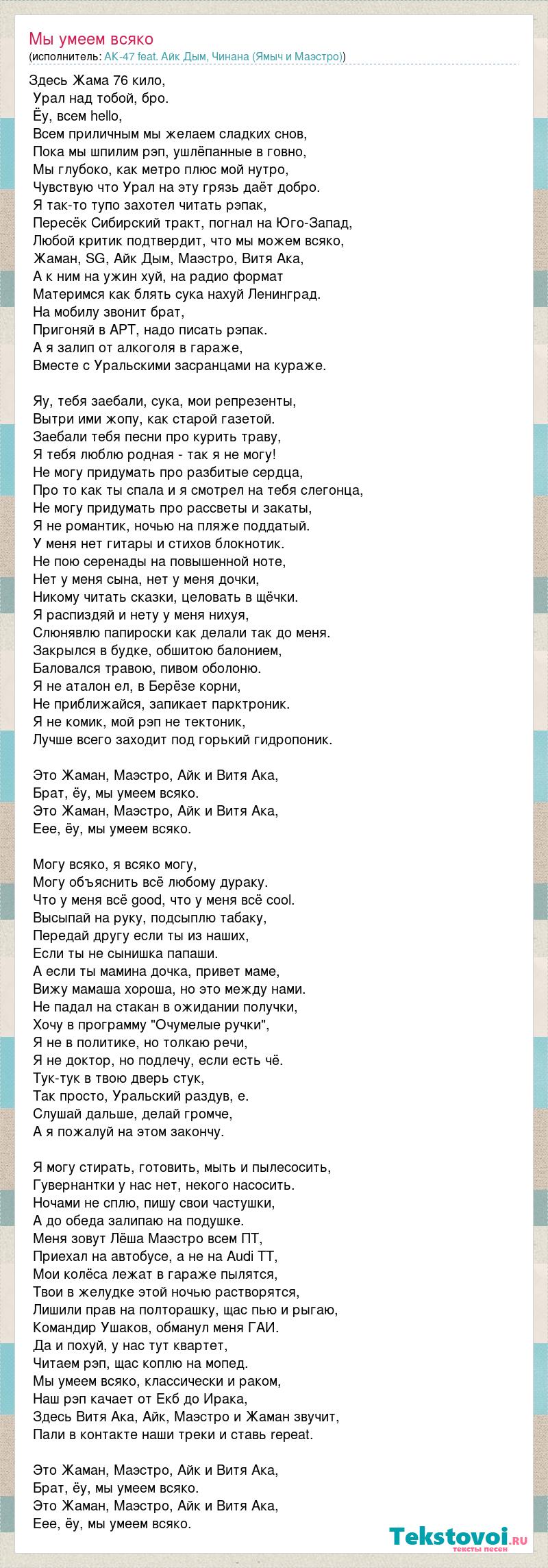 Здесь Жама 76 кило, Урал над тобой, бро. Ёу, всем hello, Всем приличным мы желаем сладких снов, Пока мы шпилим рэп, ушлёпанные в говно, Мы глубоко, как метро плюс мой нутро, Чувствую что Урал на эту грязь даёт добро. Я так-то тупо захотел читать рэпак, Пересёк Сибирский тракт, погнал на Юго-Запад, Любой критик подтвердит, что мы можем всяко, Жаман, SG, Айк Дым, Маэстро, Витя Ака, А к ним на ужин хуй, на радио формат Материмся как блять сука нахуй Ленинград. На мобилу звонит брат, Пригоняй в АРТ, надо писать рэпак. А я залип от алкоголя в гараже, Вместе с Уральскими засранцами на кураже. Яу, тебя заебали, сука, мои репрезенты, Вытри ими жопу, как старой газетой. Заебали тебя песни про курить траву, Я тебя люблю родная - так я не могу! Не могу придумать про разбитые сердца, Про то как ты спала и я смотрел на тебя слегонца, Не могу придумать про рассветы и закаты, Я не романтик, ночью на пляже поддатый. У меня нет гитары и стихов блокнотик. Не пою серенады на повышенной ноте, Нет у меня сына, нет у меня дочки, Никому читать сказки, целовать в щёчки. Я распиздяй и нету у меня нихуя, Слюнявлю папироски как делали так до меня. Закрылся в будке, обшитою балонием, Баловался травою, пивом оболоню. Я не аталон ел, в Берёзе корни, Не приближайся, запикает парктроник. Я не комик, мой рэп не тектоник, Лучше всего заходит под горький гидропоник. Это Жаман, Маэстро, Айк и Витя Ака, Брат, ёу, мы умеем всяко. Это Жаман, Маэстро, Айк и Витя Ака, Еее, ёу, мы умеем всяко. Могу всяко, я всяко могу, Могу объяснить всё любому дураку. Что у меня всё good, что у меня всё cool. Высыпай на руку, подсыплю табаку, Передай другу если ты из наших, Если ты не сынишка папаши. А если ты мамина дочка, привет маме, Вижу мамаша хороша, но это между нами. Не падал на стакан в ожидании получки, Хочу в программу "Очумелые ручки", Я не в политике, но толкаю речи, Я не доктор, но подлечу, если есть чё. Тук-тук в твою дверь стук, Так просто, Уральский раздув, е. Слушай дальше, делай громче, А я пожалуй на этом закончу. Я могу стирать, готовить, мыть и пылесосить, Гувернантки у нас нет, некого насосить. Ночами не сплю, пишу свои частушки, А до обеда залипаю на подушке. Меня зовут Лёша Маэстро всем ПТ, Приехал на автобусе, а не на Audi TT, Мои колёса лежат в гараже пылятся, Твои в желудке этой ночью растворятся, Лишили прав на полторашку, щас пью и рыгаю, Командир Ушаков, обманул меня ГАИ. Да и похуй, у нас тут квартет, Читаем рэп, щас коплю на мопед. Мы умеем всяко, классически и раком, Наш рэп качает от Екб до Ирака, Здесь Витя Ака, Айк, Маэстро и Жаман звучит, Пали в контакте наши треки и ставь repeat. Это Жаман, Маэстро, Айк и Витя Ака, Брат, ёу, мы умеем всяко. Это Жаман, Маэстро, Айк и Витя Ака, Еее, ёу, мы умеем всяко.