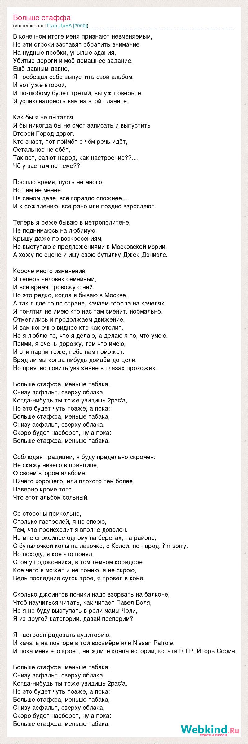 В конечном итоге меня признают невменяемым, Но эти строки заставят обратить внимание На нудные пробки, унылые здания, Убитые дороги и моё домашнее задание. Ещё давным-давно, Я пообещал себе выпустить свой альбом, И вот уже второй, И по-любому будет третий, вы уж поверьте, Я успею надоесть вам на этой планете. Как бы я не пытался, Я бы никогда бы не смог записать и выпустить Второй Город дорог. Кто знает, тот поймёт о чём речь идёт, Остальное не ебёт, Так вот, салют народ, как настроение??.... Чё у вас там по теме?? Прошло время, пусть не много, Но тем не менее. На самом деле, всё гораздо сложнее.... И к сожалению, все рано или поздно взрослеют. Теперь я реже бываю в метрополитене, Не поднимаюсь на любимую Крышу даже по воскресениям, Не выступаю с предложениями в Московской мэрии, А хожу по сцене и ищу свою бутылку Джек Дэниэлс. Короче много изменений, Я теперь человек семейный, И всё время провожу с ней. Но это редко, когда я бываю в Москве, А так я где то по стране, качаем города на качелях. Я понятия не имею кто нас там сменит, нормально, Отметились и продолжаем движение. И вам конечно виднее кто как стелит. Но я люблю то, что я делаю, а делаю я то, что умею. Пойми, я очень дорожу, тем что имею, И эти парни тоже, небо нам поможет. Вряд ли мы когда нибудь дойдём до цели, Но приятно ловить уважение в глазах прохожих. Больше стаффа, меньше табака, Снизу асфальт, сверху облака, Когда-нибудь ты тоже увидишь 2pac'а, Но это будет чуть позже, а пока: Больше стаффа, меньше табака, Снизу асфальт, сверху облака. Скоро будет наоборот, ну а пока: Больше стаффа, меньше табака. Соблюдая традиции, я буду предельно скромен: Не скажу ничего в принципе, О своём втором альбоме. Ничего хорошего, или плохого тем более, Наверно кроме того, Что этот альбом сольный. Со стороны прикольно, Столько гастролей, я не спорю, Тем, что происходит я вполне доволен. Но мне спокойнее одному на берегах, на районе, С бутылочкой колы на лавочке, с Колей, но народ, i'm sorry. Но походу, я кое что понял, Стоя у подоконника, в том тёмном коридоре. Кое чего я может и не помню, я не скрою, Ведь последние суток трое, я провёл в коме. Сколько джоинтов поники надо взорвать на балконе, Чтоб научиться читать, как читает Павел Воля, Но я не буду выступать в роли мамы Чоли, Я из другой категории, давай поспорим? Я настроен радовать аудиторию, И качать на повторе в той восьмёре или Nissan Patrole, И пока меня это кроет, не ждите конца истории, кстати R.I.P. Игорь Сорин. Больше стаффа, меньше табака, Снизу асфальт, сверху облака. Когда-нибудь ты тоже увидишь 2pac'а, Но это будет чуть позже, а пока: Больше стаффа, меньше табака, Снизу асфальт, сверху облака, Скоро будет наоборот, ну а пока: Больше стаффа, меньше табака.