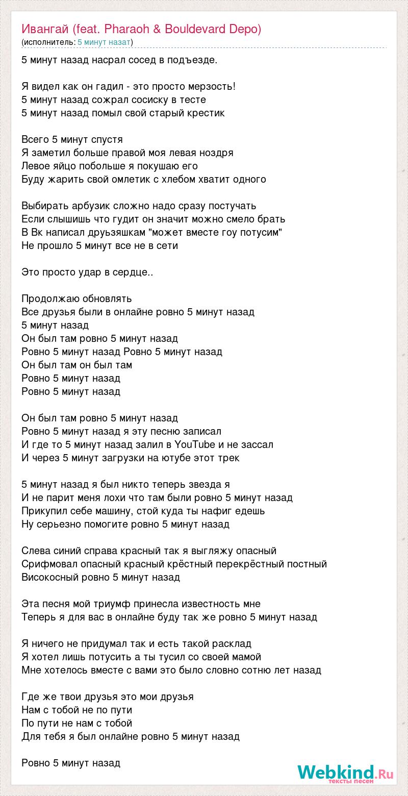 5 минут назад насрал сосед в подъезде. Я видел как он гадил - это просто мерзость! 5 минут назад сожрал сосиску в тесте 5 минут назад помыл свой старый крестик Всего 5 минут спустя Я заметил больше правой моя левая ноздря Левое яйцо побольше я покушаю его Буду жарить свой омлетик с хлебом хватит одного Выбирать арбузик сложно надо сразу постучать Если слышишь что гудит он значит можно смело брать В Вк написал друьзяшкам "может вместе гоу потусим" Не прошло 5 минут все не в сети Это просто удар в сердце.. Продолжаю обновлять Все друзья были в онлайне ровно 5 минут назад 5 минут назад Он был там ровно 5 минут назад Ровно 5 минут назад Ровно 5 минут назад Он был там он был там Ровно 5 минут назад Ровно 5 минут назад Он был там ровно 5 минут назад Ровно 5 минут назад я эту песню записал И где то 5 минут назад залил в YouTube и не зассал И через 5 минут загрузки на ютубе этот трек 5 минут назад я был никто теперь звезда я И не парит меня лохи что там были ровно 5 минут назад Прикупил себе машину, стой куда ты нафиг едешь Ну серьезно помогите ровно 5 минут назад Слева синий справа красный так я выгляжу опасный Срифмовал опасный красный крёстный перекрёстный постный Високосный ровно 5 минут назад Эта песня мой триумф принесла известность мне Теперь я для вас в онлайне буду так же ровно 5 минут назад Я ничего не придумал так и есть такой расклад Я хотел лишь потусить а ты тусил со своей мамой Мне хотелось вместе с вами это было словно сотню лет назад Где же твои друзья это мои друзья Нам с тобой не по пути По пути не нам с тобой Для тебя я был онлайне ровно 5 минут назад Ровно 5 минут назад