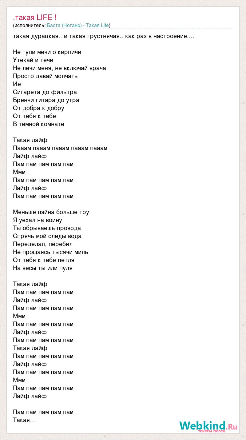 такая дурацкая.. и такая грустнячая.. как раз в настроение.... Не тупи мечи о кирпичи Утекай и течи Не лечи меня, не включай врача Просто давай молчать Ие Сигарета до фильтра Бренчи гитара до утра От добра к добру От тебя к тебе В темной комнате Такая лайф Пааам пааам пааам пааам пааам Лайф лайф Пам пам пам пам пам Ммм Пам пам пам пам пам Лайф лайф Пам пам пам пам пам Меньше пэйна больше тру Я уехал на воину Ты обрываешь провода Спрячь мой следы вода Переделал, перебил Не прощаясь тысячи миль От тебя к тебе петля На весы ты или пуля Такая лайф Пам пам пам пам пам Лайф лайф Пам пам пам пам пам Ммм Пам пам пам пам пам Лайф лайф Пам пам пам пам пам Такая лайф Пам пам пам пам пам Лайф лайф Пам пам пам пам пам Ммм Пам пам пам пам пам Лайф лайф Пам пам пам пам пам Такая…