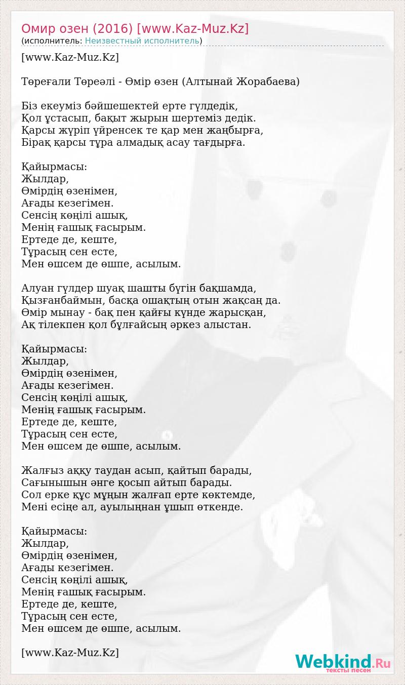 [www.Kaz-Muz.Kz] Төреғали Төреәлі - Өмір өзен (Алтынай Жорабаева) Біз екеуміз бәйшешектей ерте гүлдедік, Қол ұстасып, бақыт жырын шертеміз дедік. Қарсы жүріп үйренсек те қар мен жаңбырға, Бірақ қарсы тұра алмадық асау тағдырға. Қайырмасы: Жылдар, Өмірдің өзенімен, Ағады кезегімен. Сенсің көңілі ашық, Менің ғашық ғасырым. Ертеде де, кеште, Тұрасың сен есте, Мен өшсем де өшпе, асылым. Алуан гүлдер шуақ шашты бүгін бақшамда, Қызғанбаймын, басқа ошақтың отын жақсаң да. Өмір мынау - бақ пен қайғы күнде жарысқан, Ақ тілекпен қол бұлғайсың әркез алыстан. Қайырмасы: Жылдар, Өмірдің өзенімен, Ағады кезегімен. Сенсің көңілі ашық, Менің ғашық ғасырым. Ертеде де, кеште, Тұрасың сен есте, Мен өшсем де өшпе, асылым. Жалғыз аққу таудан асып, қайтып барады, Сағынышын әнге қосып айтып барады. Сол ерке құс мұңын жалғап ерте көктемде, Мені есіңе ал, ауылыңнан ұшып өткенде. Қайырмасы: Жылдар, Өмірдің өзенімен, Ағады кезегімен. Сенсің көңілі ашық, Менің ғашық ғасырым. Ертеде де, кеште, Тұрасың сен есте, Мен өшсем де өшпе, асылым. [www.Kaz-Muz.Kz]