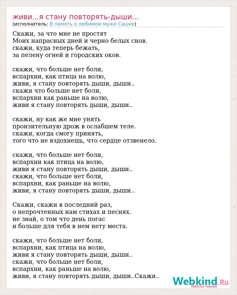 Скажи, за что мне не простят Моих напрасных дней и черно белых снов. скажи, куда теперь бежать, за пелену огней и городских оков. скажи, что больше нет боли, вспархни, как птица на волю, живи, я стану повторять дыши, дыши.. скажи что больше нет боли, вспархни как раньше на волю, живи я стану повторять дыши, дыши.. скажи, ну как же мне унять пронзительную дрож в ослабшем теле. скажи, когда смогу принять, того что не вздохнешь, что сердце отзвенело. скажи, что больше нет боли, вспархни как птица на волю, живи я стану повторять дыши, дыши.. скажи, что больше нет боли, вспархни, как раньше на волю, живи, я стану повторять дыши, дыши.. Скажи, скажи в последний раз, о непрочтенных нам стихах и песнях. не знай, о том что день погас и больше для тебя в нем нету места. скажи, что больше нет боли, вспархни, как птица на волю, живи я стану повторять дыши, дыши.. скажи, что больше нет боли, вспархни, как раньше на волю, живи, я стану повторять дыши, дыши..Скажи..