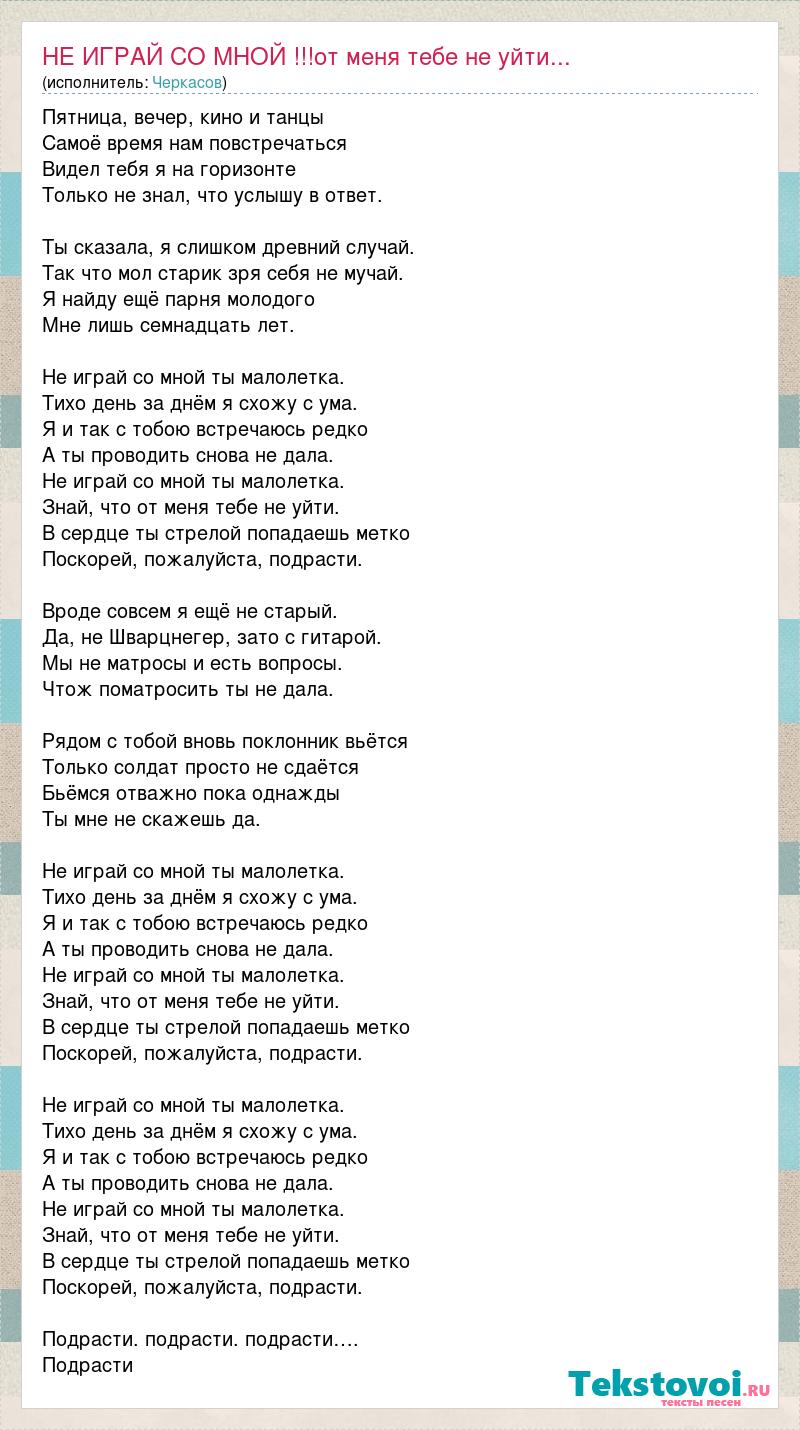 Пятница, вечер, кино и танцы Самоё время нам повстречаться Видел тебя я на горизонте Только не знал, что услышу в ответ. Ты сказала, я слишком древний случай. Так что мол старик зря себя не мучай. Я найду ещё парня молодого Мне лишь семнадцать лет. Не играй со мной ты малолетка. Тихо день за днём я схожу с ума. Я и так с тобою встречаюсь редко А ты проводить снова не дала. Не играй со мной ты малолетка. Знай, что от меня тебе не уйти. В сердце ты стрелой попадаешь метко Поскорей, пожалуйста, подрасти. Вроде совсем я ещё не старый. Да, не Шварцнегер, зато с гитарой. Мы не матросы и есть вопросы. Чтож поматросить ты не дала. Рядом с тобой вновь поклонник вьётся Только солдат просто не сдаётся Бьёмся отважно пока однажды Ты мне не скажешь да. Не играй со мной ты малолетка. Тихо день за днём я схожу с ума. Я и так с тобою встречаюсь редко А ты проводить снова не дала. Не играй со мной ты малолетка. Знай, что от меня тебе не уйти. В сердце ты стрелой попадаешь метко Поскорей, пожалуйста, подрасти. Не играй со мной ты малолетка. Тихо день за днём я схожу с ума. Я и так с тобою встречаюсь редко А ты проводить снова не дала. Не играй со мной ты малолетка. Знай, что от меня тебе не уйти. В сердце ты стрелой попадаешь метко Поскорей, пожалуйста, подрасти. Подрасти. подрасти. подрасти…. Подрасти