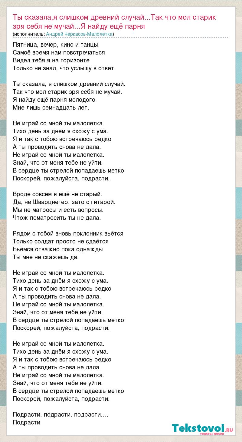 Пятница, вечер, кино и танцы Самоё время нам повстречаться Видел тебя я на горизонте Только не знал, что услышу в ответ. Ты сказала, я слишком древний случай. Так что мол старик зря себя не мучай. Я найду ещё парня молодого Мне лишь семнадцать лет. Не играй со мной ты малолетка. Тихо день за днём я схожу с ума. Я и так с тобою встречаюсь редко А ты проводить снова не дала. Не играй со мной ты малолетка. Знай, что от меня тебе не уйти. В сердце ты стрелой попадаешь метко Поскорей, пожалуйста, подрасти. Вроде совсем я ещё не старый. Да, не Шварцнегер, зато с гитарой. Мы не матросы и есть вопросы. Чтож поматросить ты не дала. Рядом с тобой вновь поклонник вьётся Только солдат просто не сдаётся Бьёмся отважно пока однажды Ты мне не скажешь да. Не играй со мной ты малолетка. Тихо день за днём я схожу с ума. Я и так с тобою встречаюсь редко А ты проводить снова не дала. Не играй со мной ты малолетка. Знай, что от меня тебе не уйти. В сердце ты стрелой попадаешь метко Поскорей, пожалуйста, подрасти. Не играй со мной ты малолетка. Тихо день за днём я схожу с ума. Я и так с тобою встречаюсь редко А ты проводить снова не дала. Не играй со мной ты малолетка. Знай, что от меня тебе не уйти. В сердце ты стрелой попадаешь метко Поскорей, пожалуйста, подрасти. Подрасти. подрасти. подрасти…. Подрасти